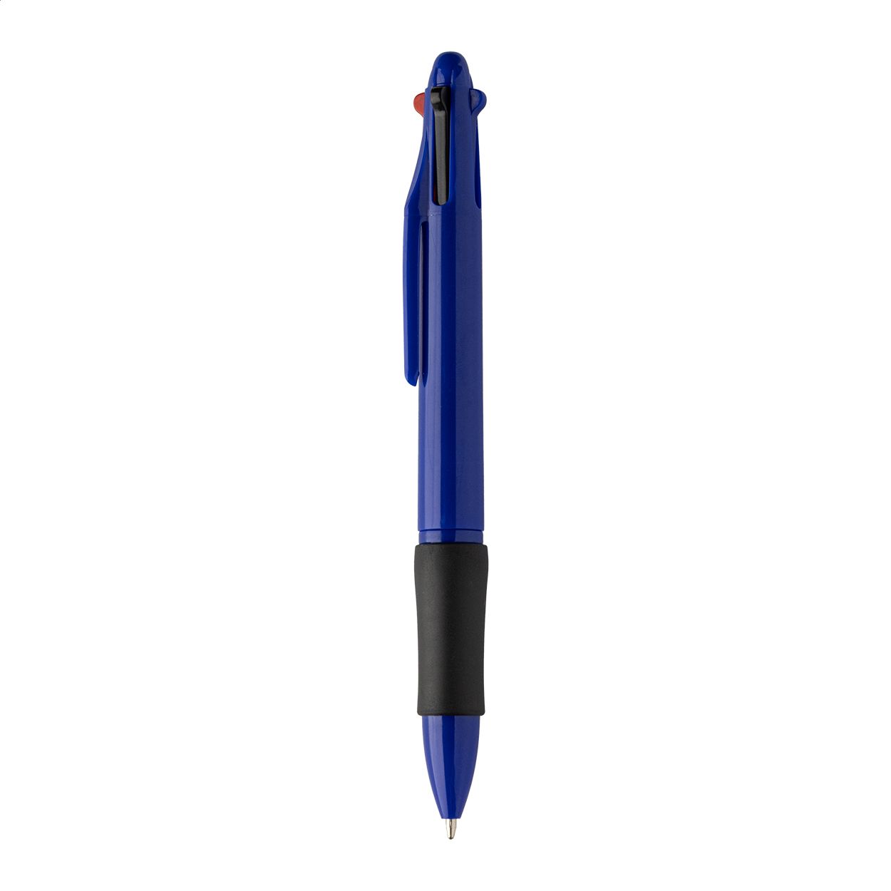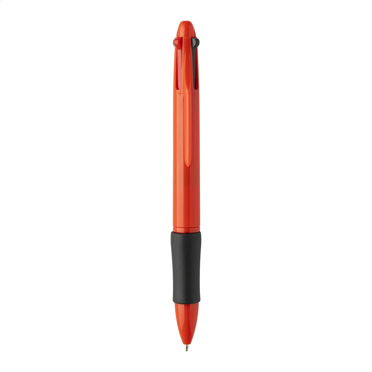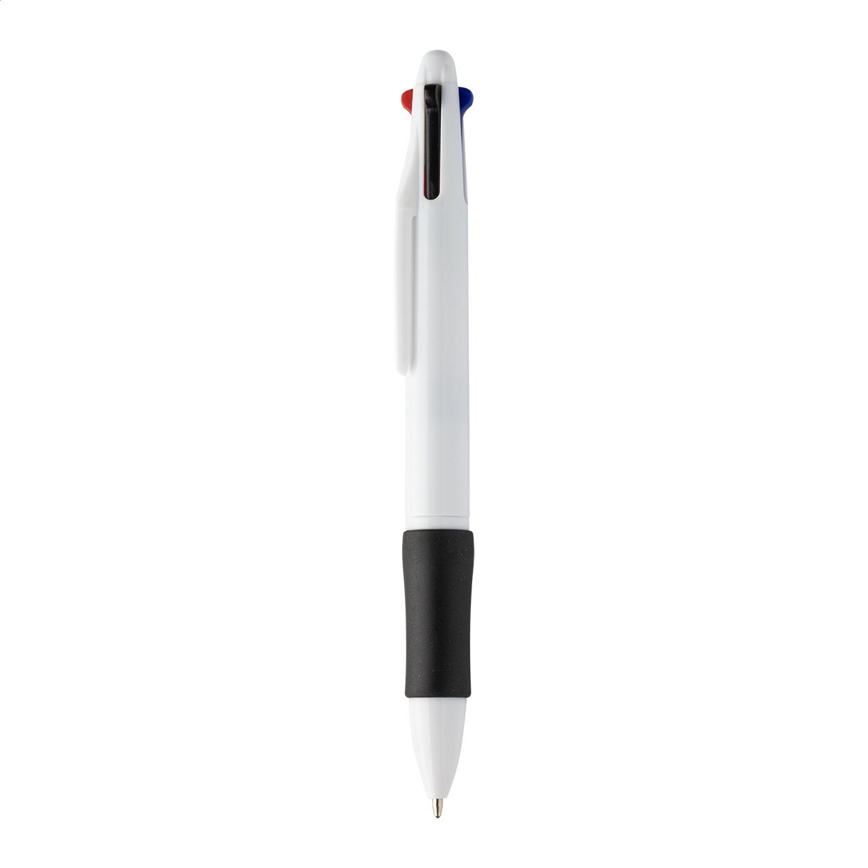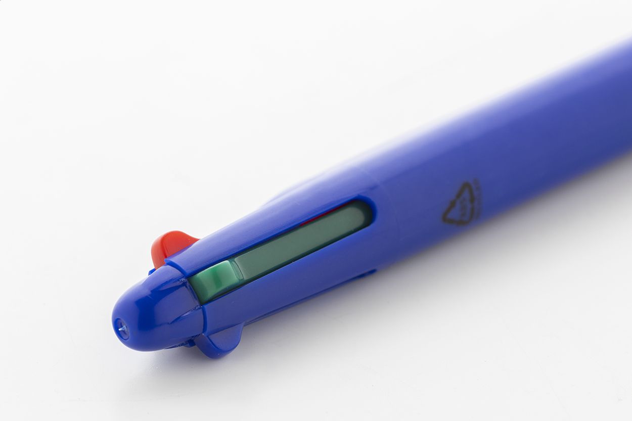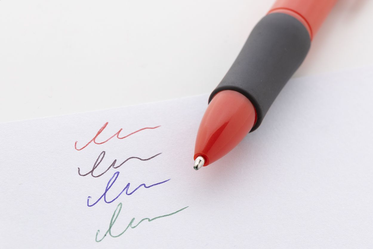 Penna a sfera multicolore in ABS riciclato con impugnatura in gomma. Refill nei colori nero, blu, rosso e verde.