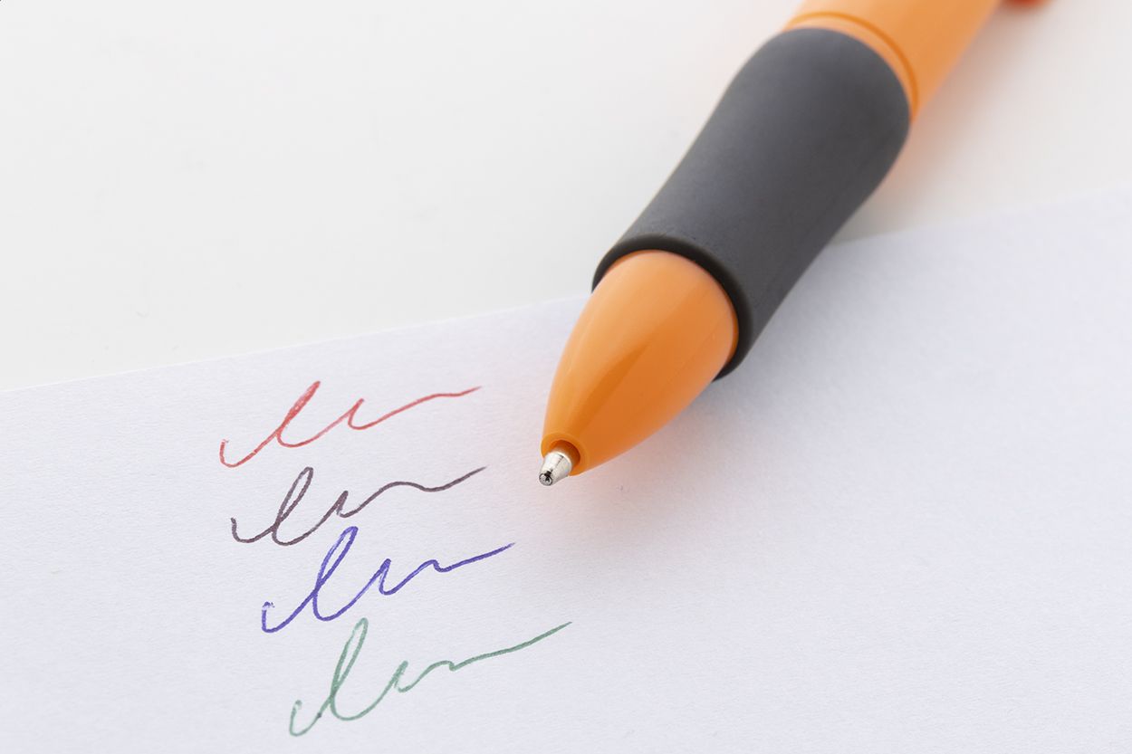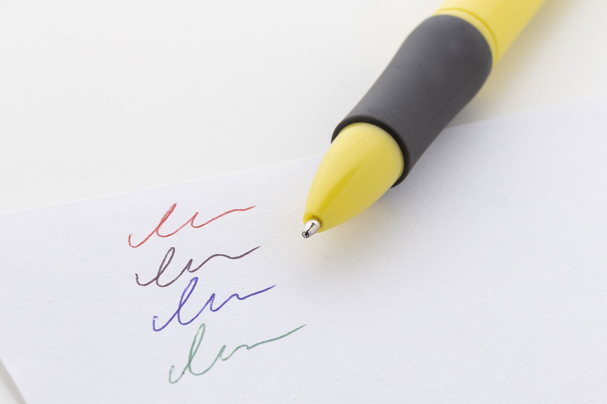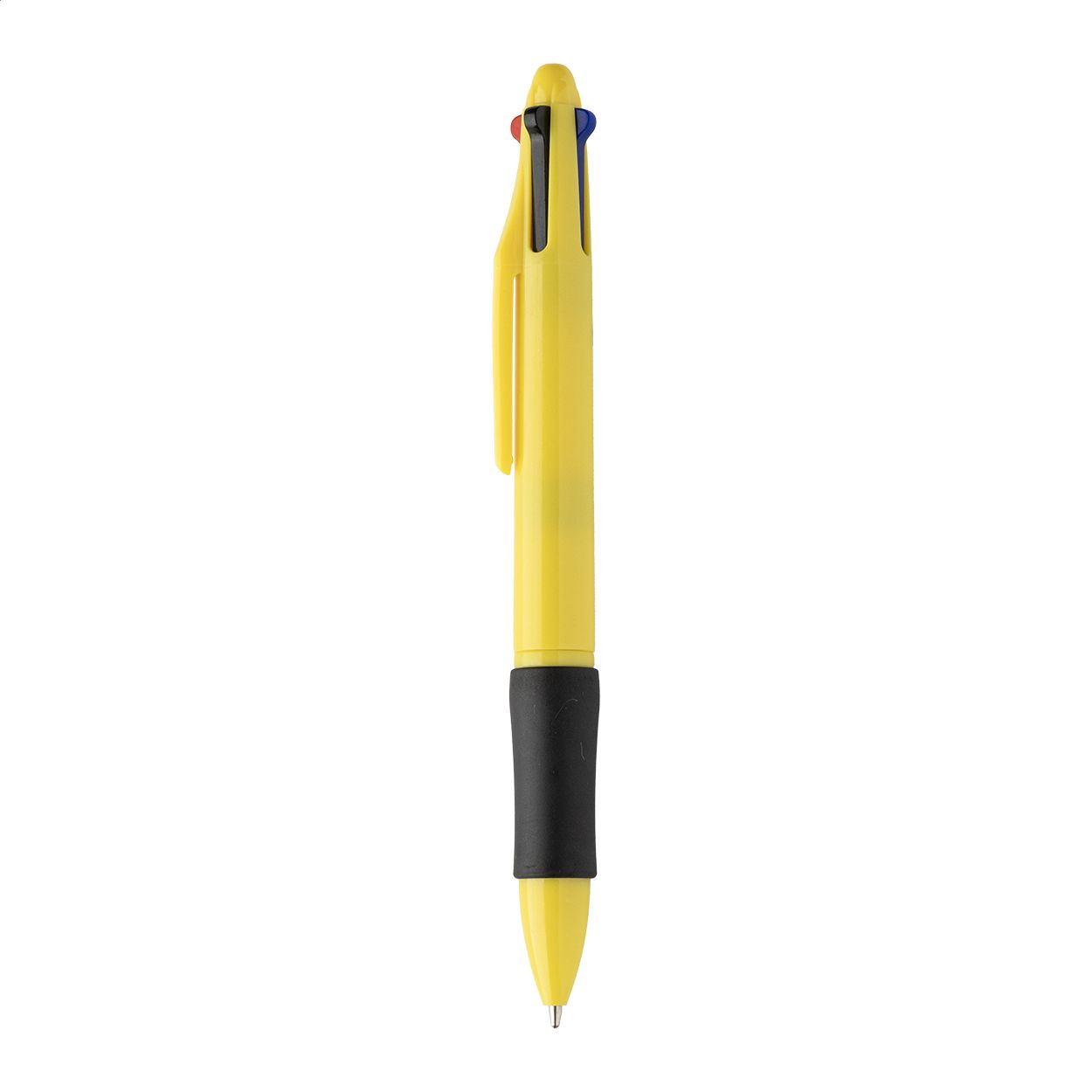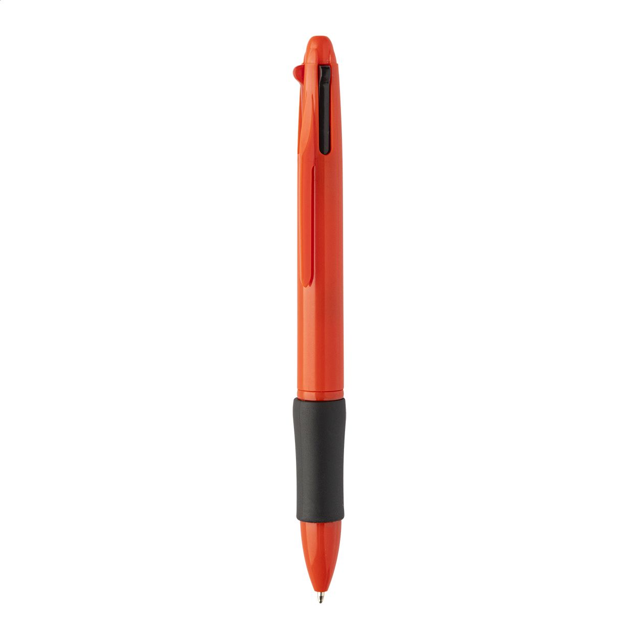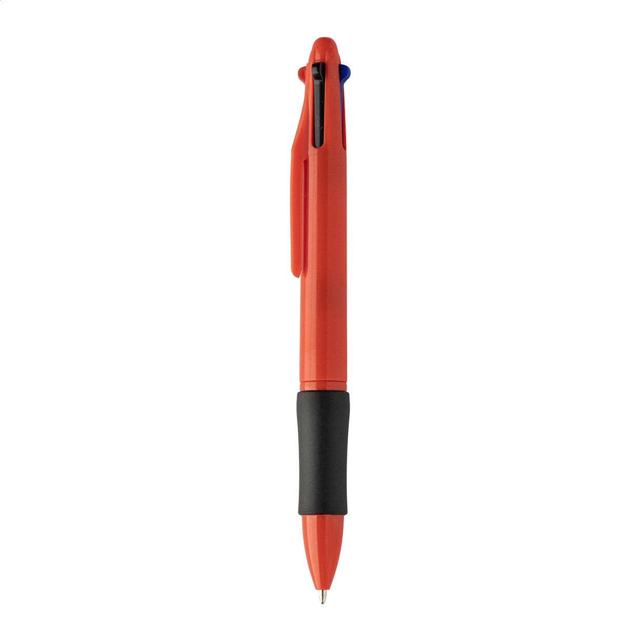 Penna a sfera multicolore in ABS riciclato con impugnatura in gomma. Refill nei colori nero, blu, rosso e verde.