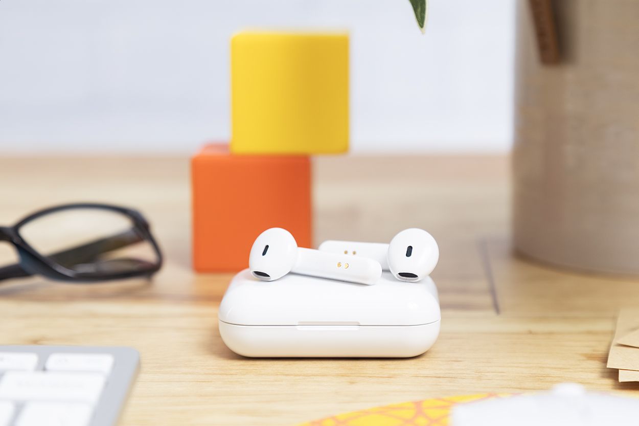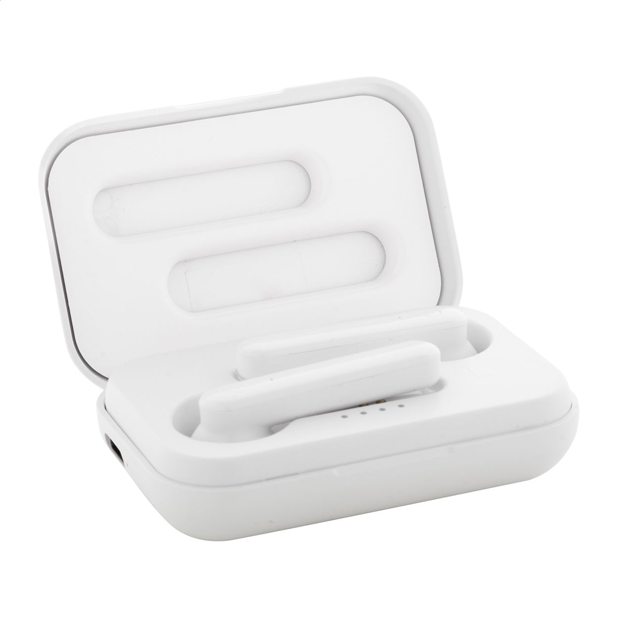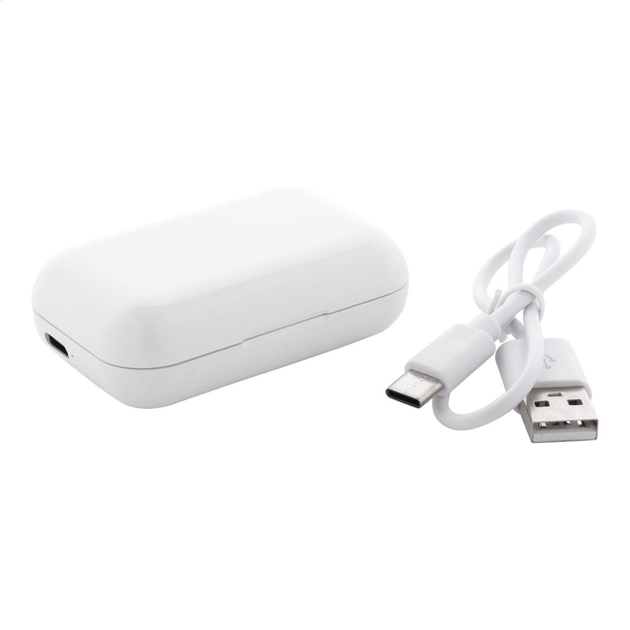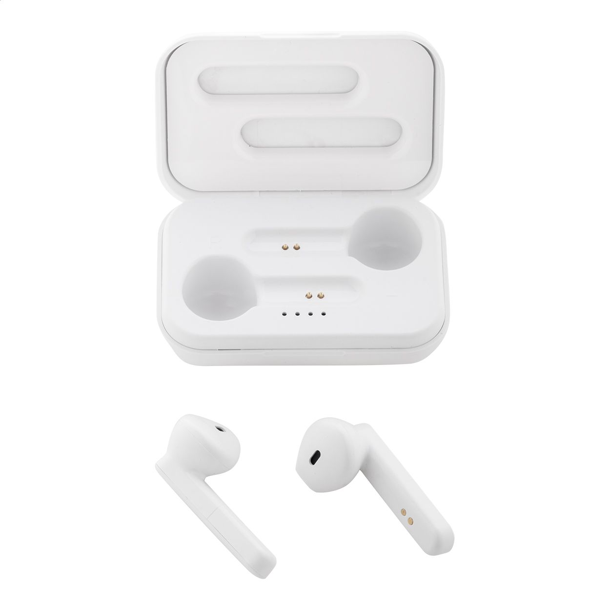 Auricolari stereo true wireless (TWS) in plastica ABS riciclata con funzione di chiamata in vivavoce, in custodia di plastica con batteria da 400 mAh. Incluso cavo di ricarica USB.