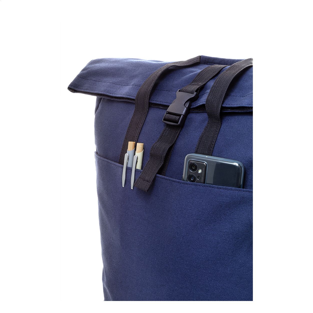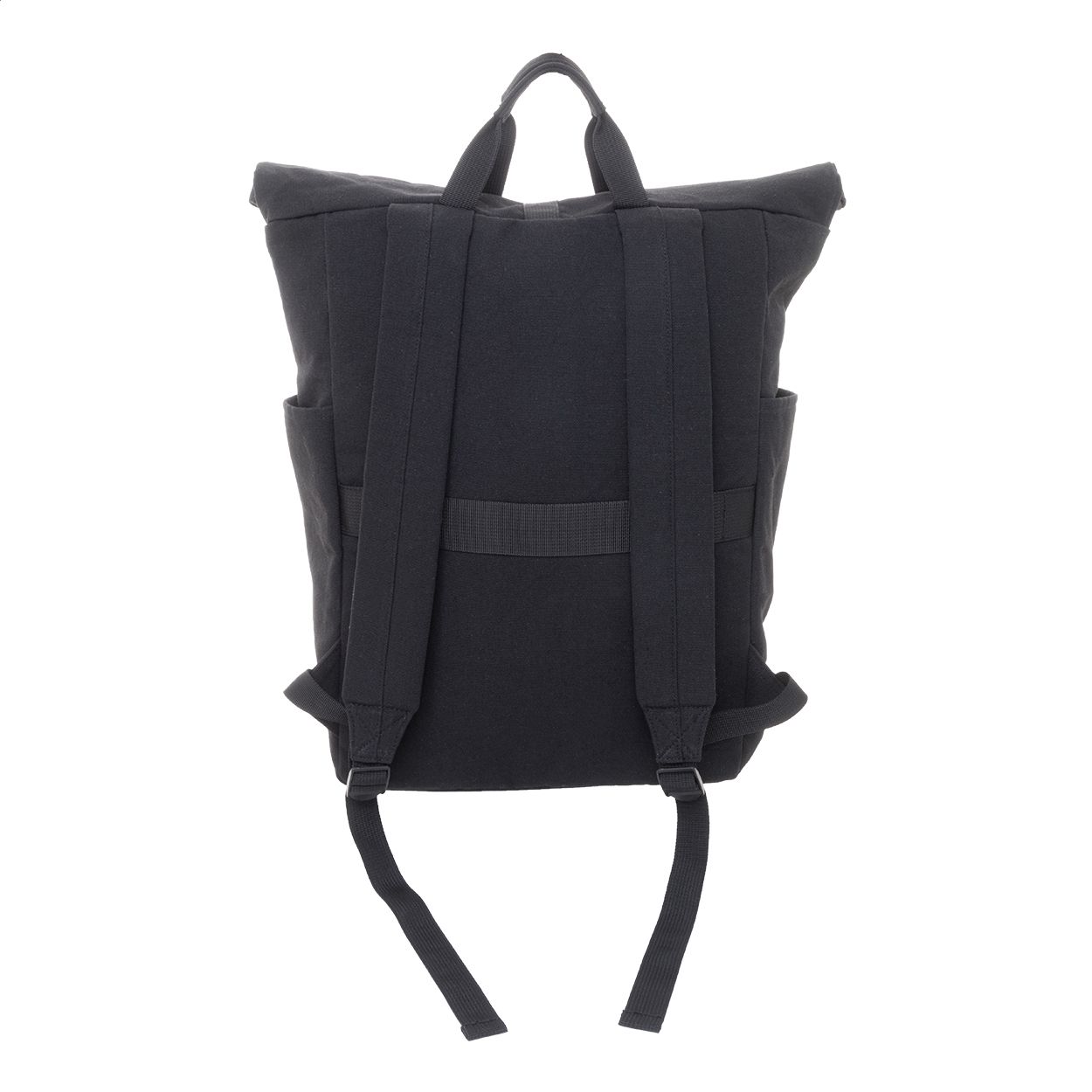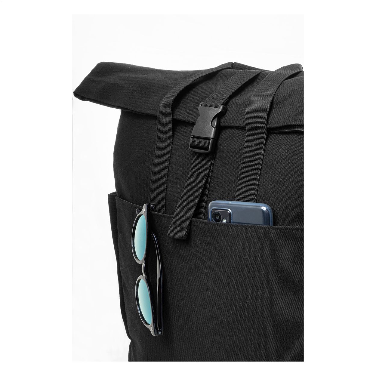 Zaino rolltop in tela riciclata con chiusura a fibbia e velcro, scomparto imbottito per laptop (15"), tasche frontali e laterali, cinghia per il trolley, schienale e spallacci imbottiti. 70% cotone riciclato e 30% poliestere RPET. Etichetta cotone riciclato.