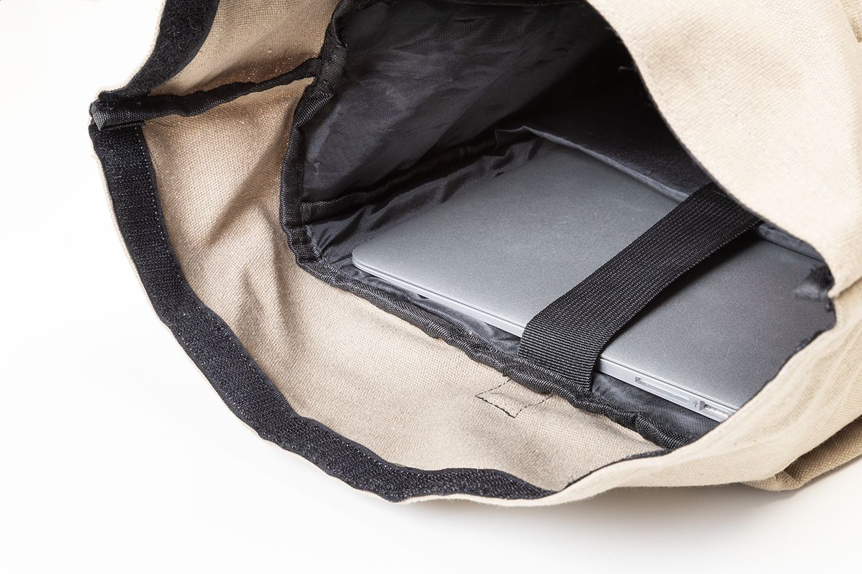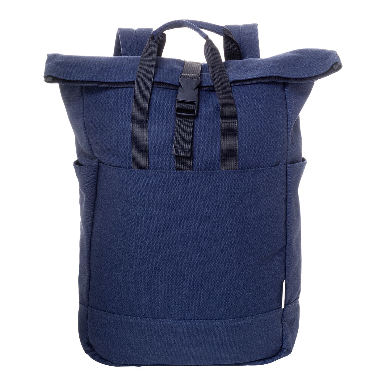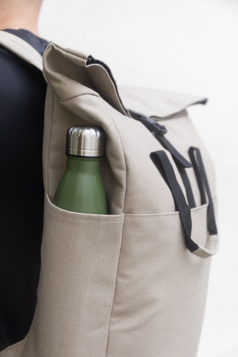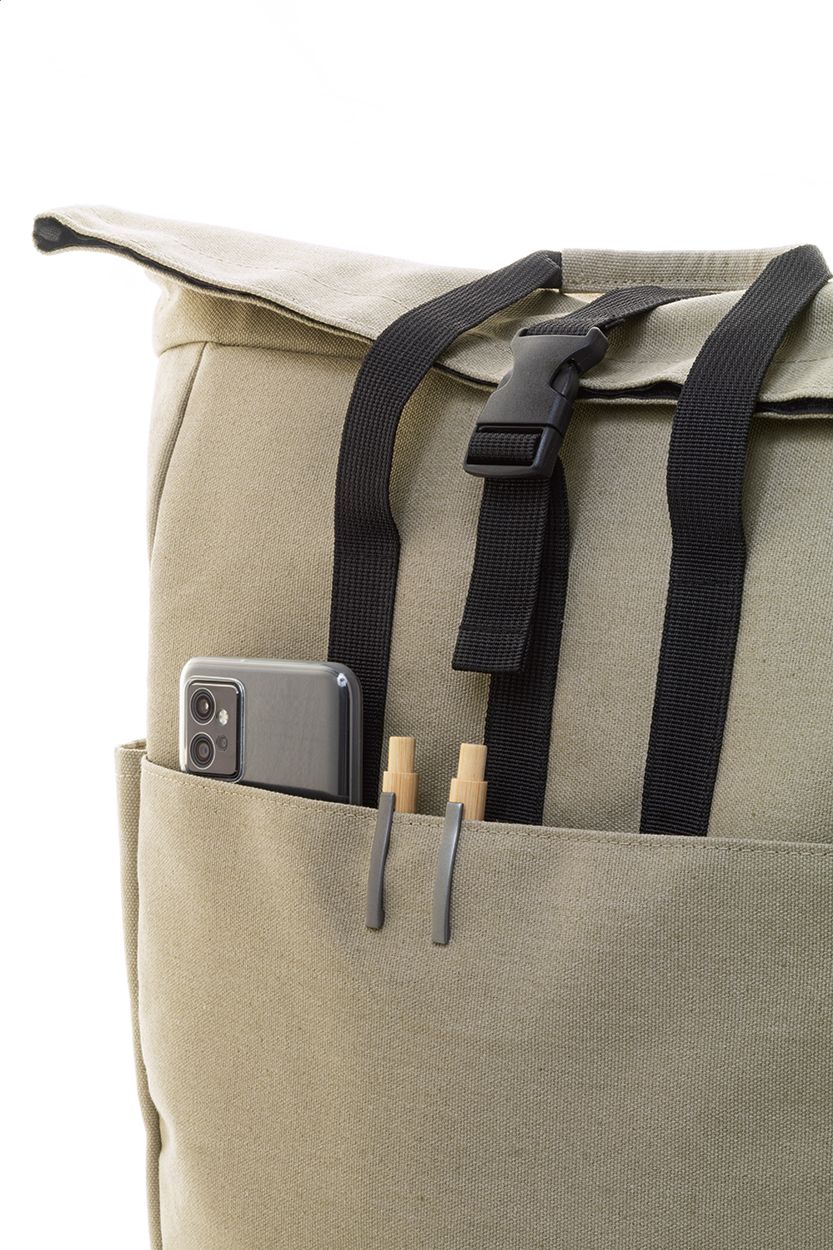 Zaino rolltop in tela riciclata con chiusura a fibbia e velcro, scomparto imbottito per laptop (15"), tasche frontali e laterali, cinghia per il trolley, schienale e spallacci imbottiti. 70% cotone riciclato e 30% poliestere RPET. Etichetta cotone riciclato.