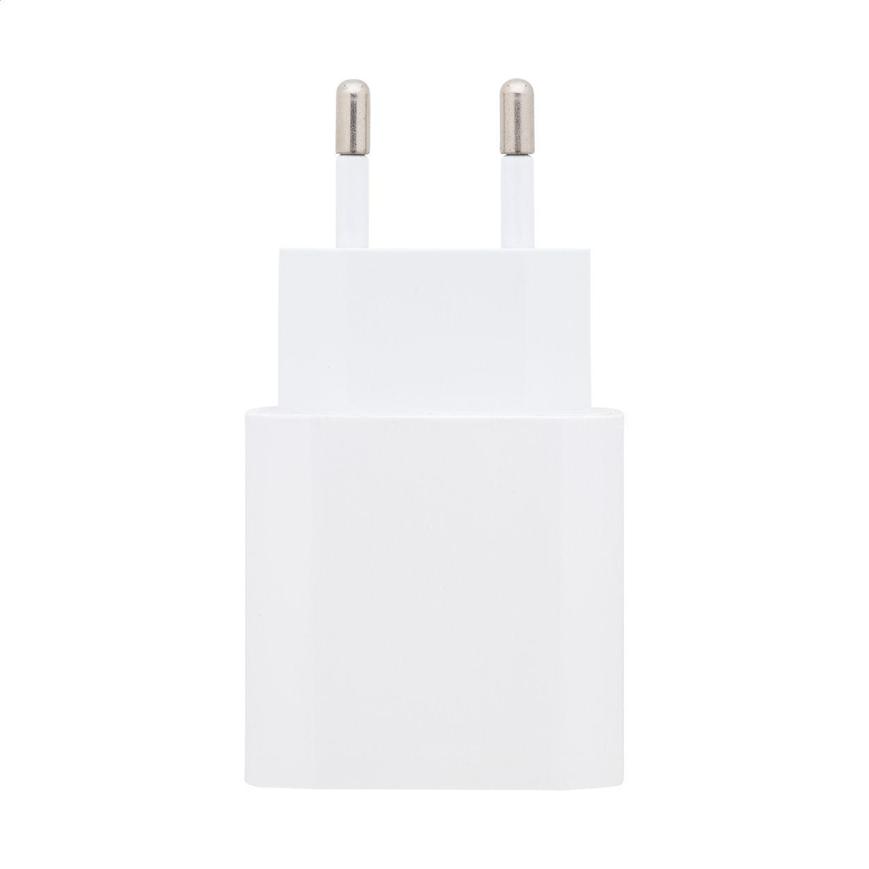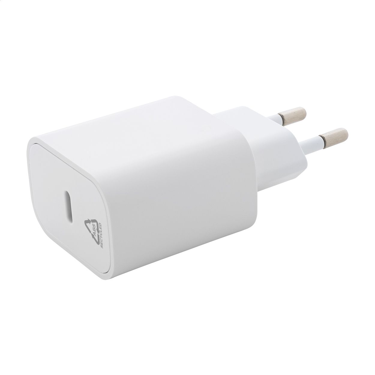 Caricatore da parete USB a ricarica rapida in ABS riciclato 1 porta USB-C, con spina europea a 2 poli e tecnologia di ricarica rapida (PD20W / QC3.0).