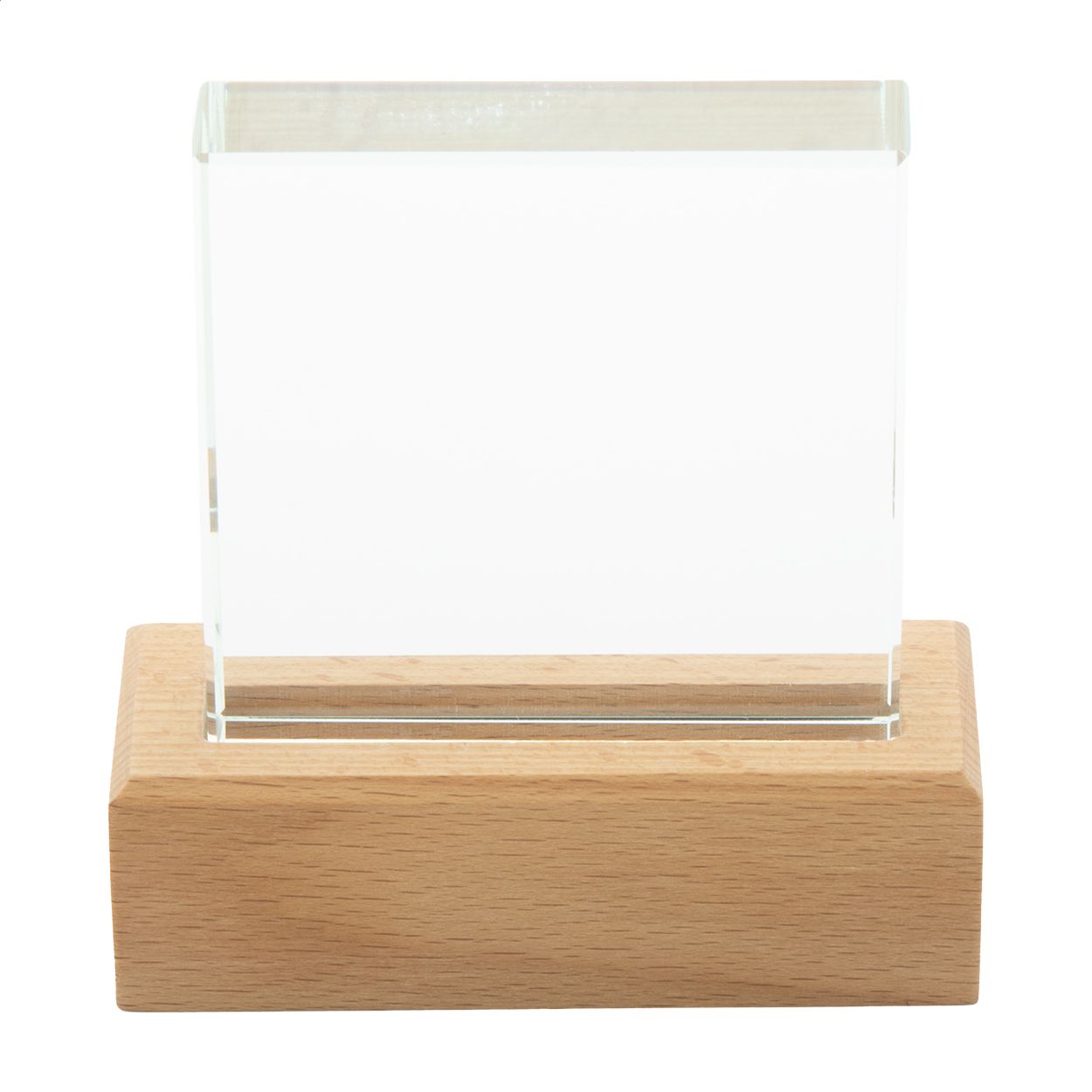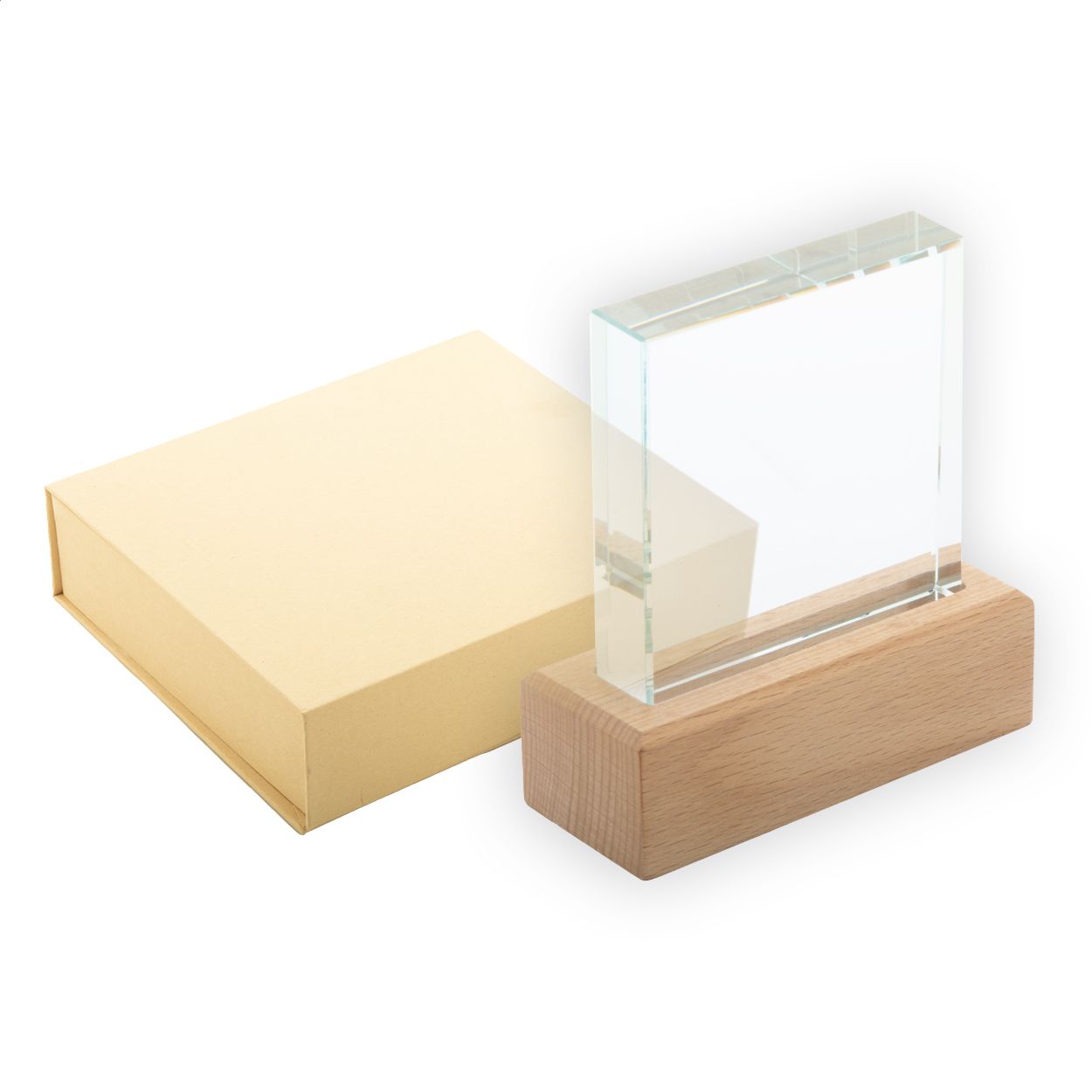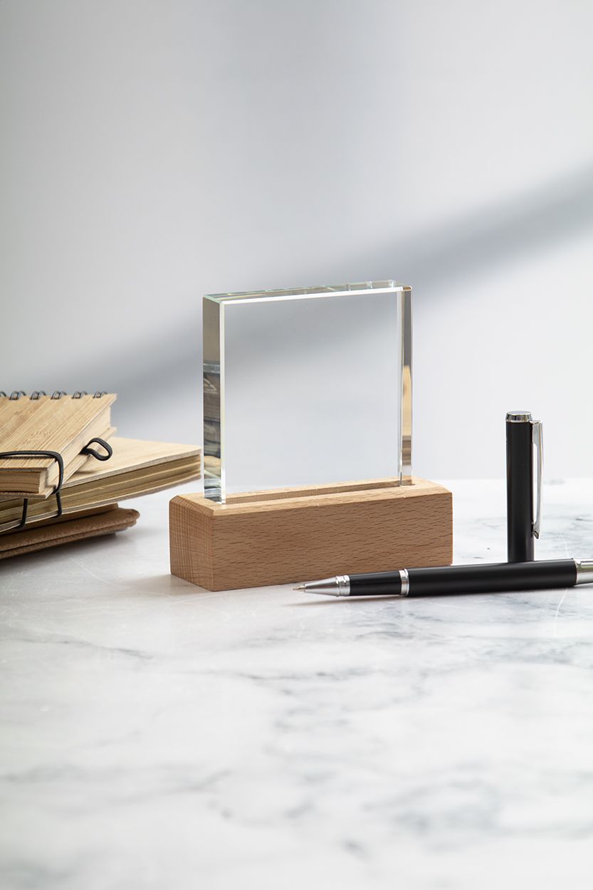 Trofeo in vetro con base in legno di faggio, completo di confezione regalo in cartoncino kraft.