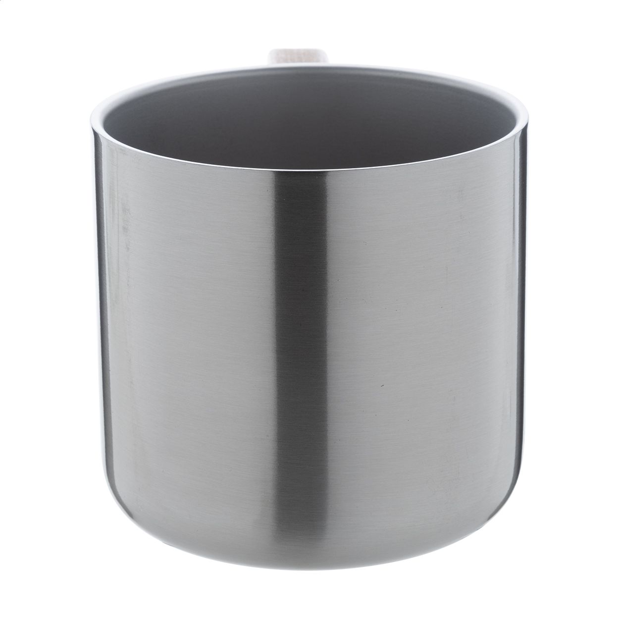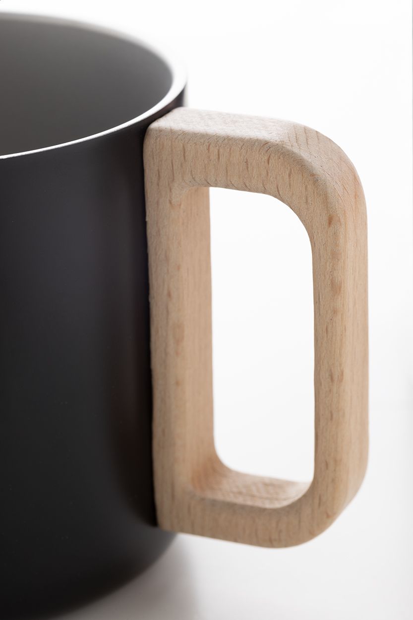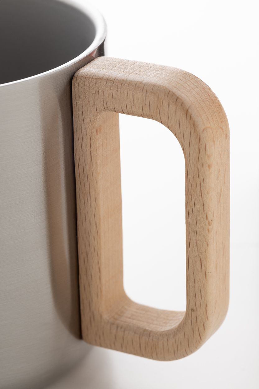 Tazza mug a doppia parete in acciaio riciclato con manico in legno e capacità di 350 ml.