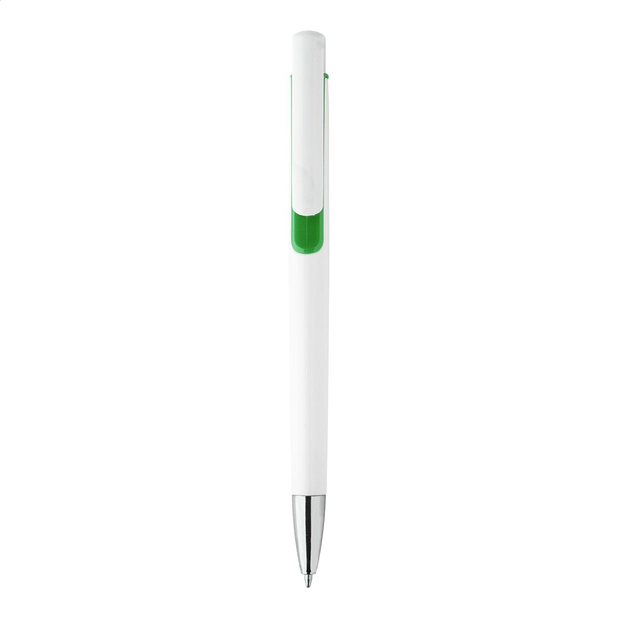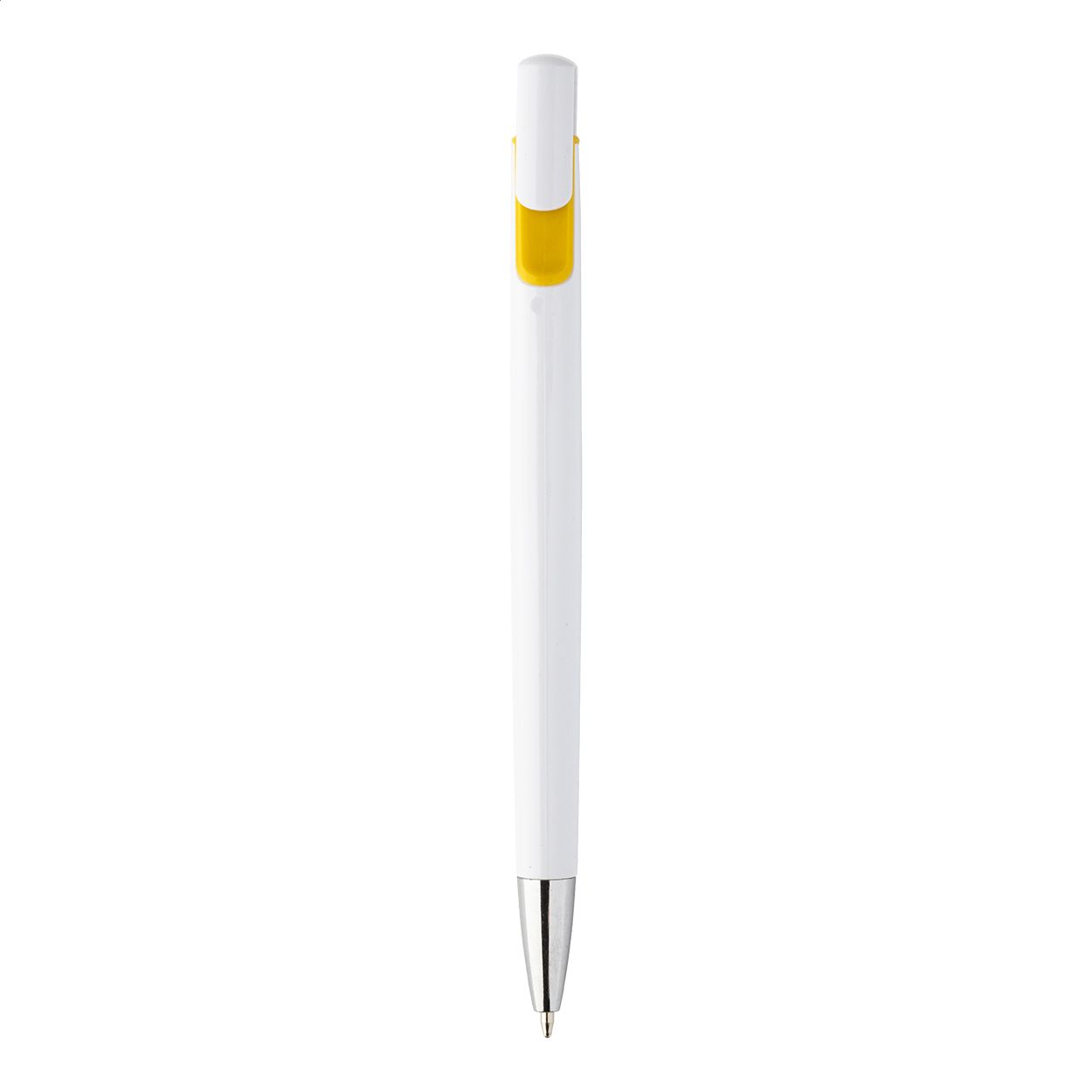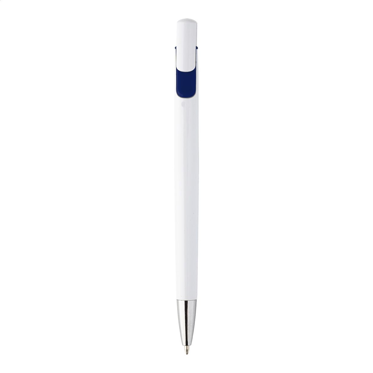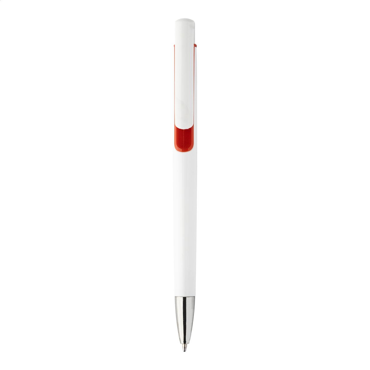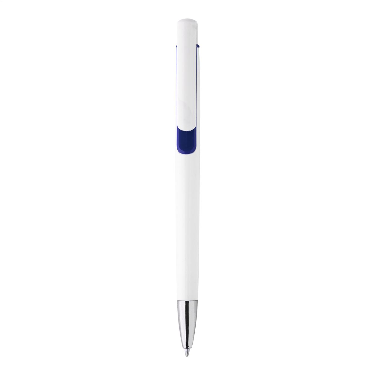 Penna a sfera in plastica bianca con particolari colorati e puntale cromato. Fornita con refill blu.