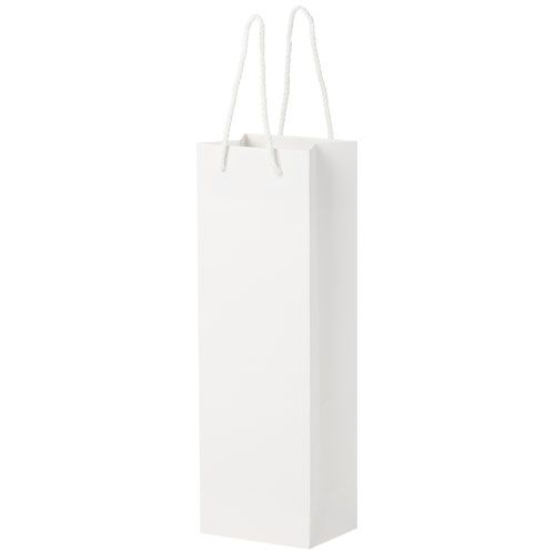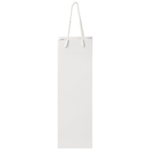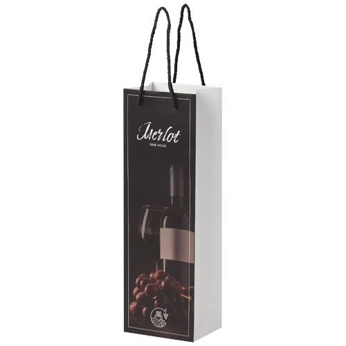Sacchetto per bottiglia di vino di carta integra da 170 g/m² opaca realizzato a mano (12 x 9 x 37 cm) con manici di plastica. La parte anteriore e posteriore personalizzabili offrono un ampio spazio per stampare un logo o qualsiasi altro design, rendendolo un ottimo strumento di marketing aziendale. Realizzata in Europa e riciclabile al 100%.