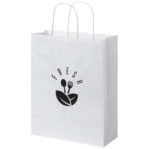 Sacchetto in carta kraft di medie dimensioni (25 × 11 × 32 cm) con manici intrecciati. Realizzato in carta proveniente da fonti responsabili (bianco 90 g/m², marrone 80 g/m²), questo sacchetto è una soluzione di imballaggio resistente con spazio sufficiente per trasportare una vasta gamma di oggetti. L’aspetto naturale e rustico della carta kraft aggiunge un tocco elegante a qualsiasi occasione. Perfetto per lo shopping, i regali o gli eventi, è un’ottima alternativa alle borse di plastica. Prodotto in Europa.