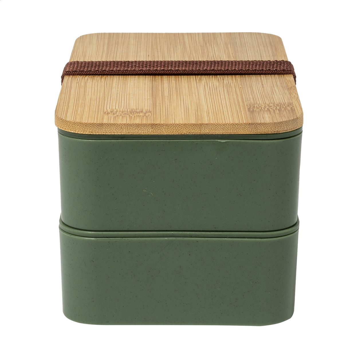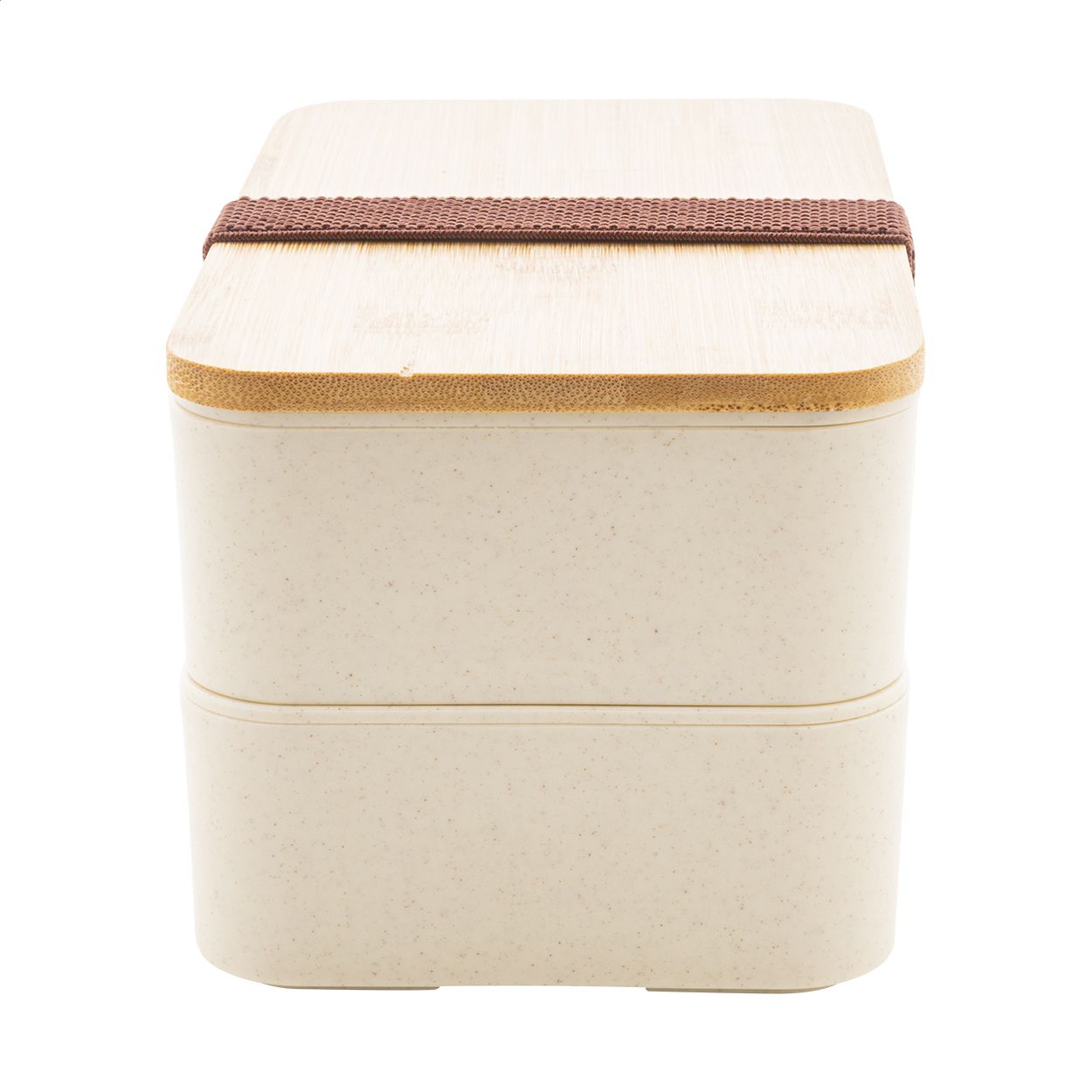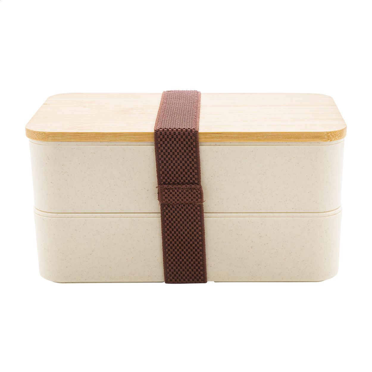 Contenitore per il pranzo in plastica PP con set di posate (forchetta, cucchiaio e coltello), coperchio in bambù e cinturino elastico. Con 2 scomparti di 700 ml di capacità ciascuno.