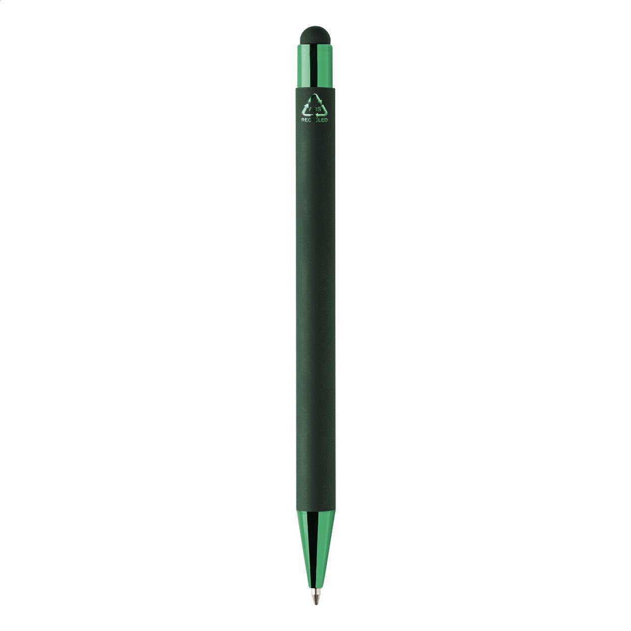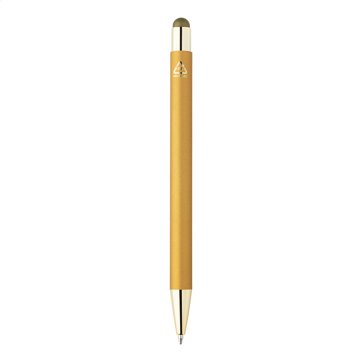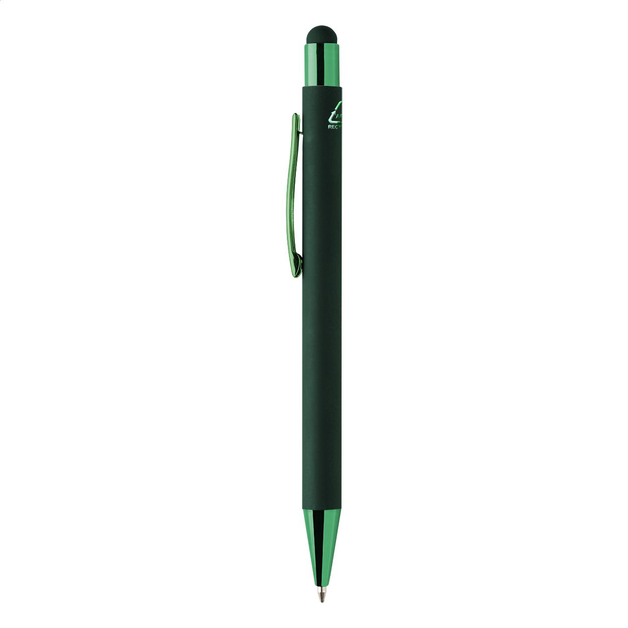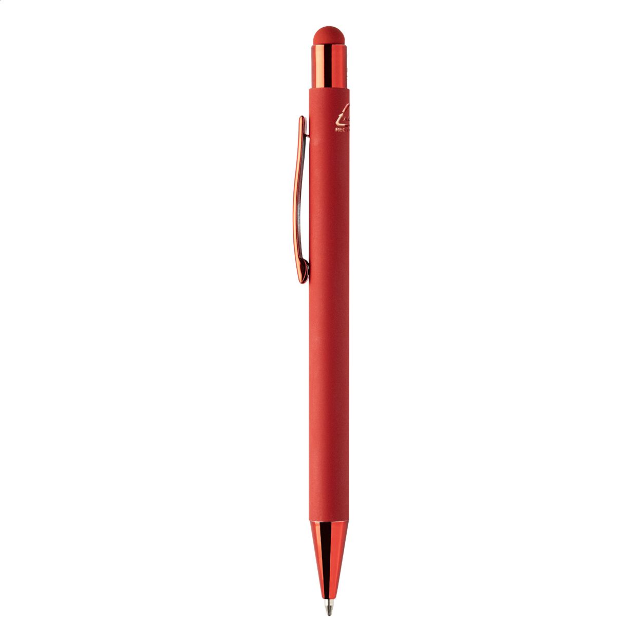 Penna a sfera capacitiva in alluminio riciclato con refill blu, fusto gommato e parti con finitura colorata metallizzata lucida. Lo speciale rivestimento permette l'incisione a specchio coordinata con le parti metalliche.