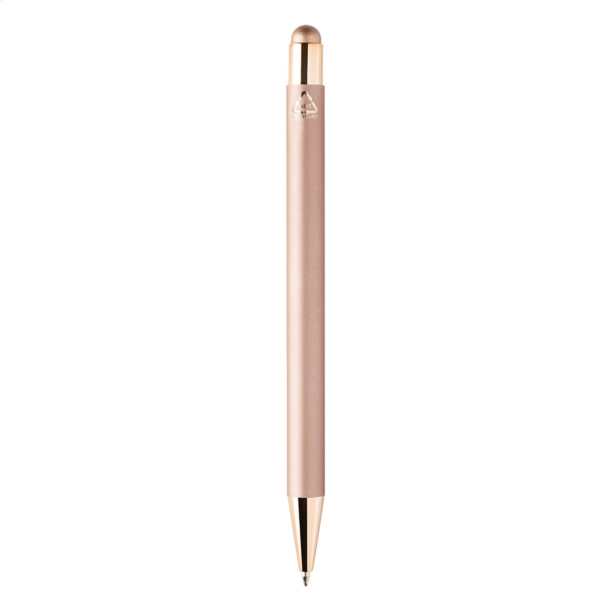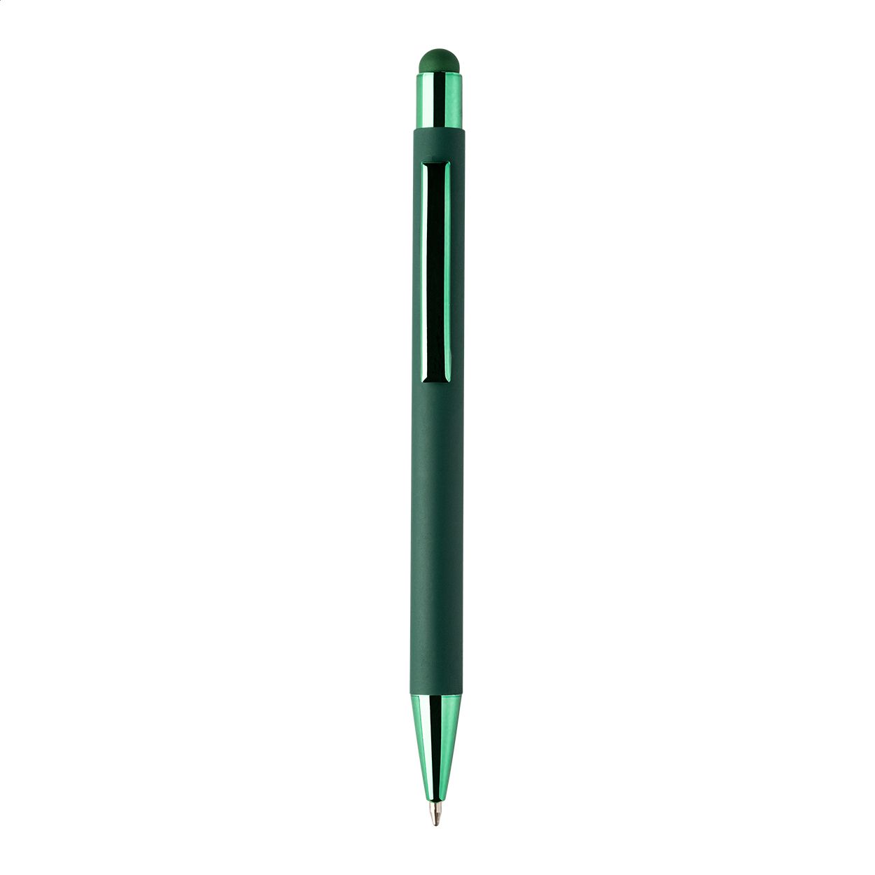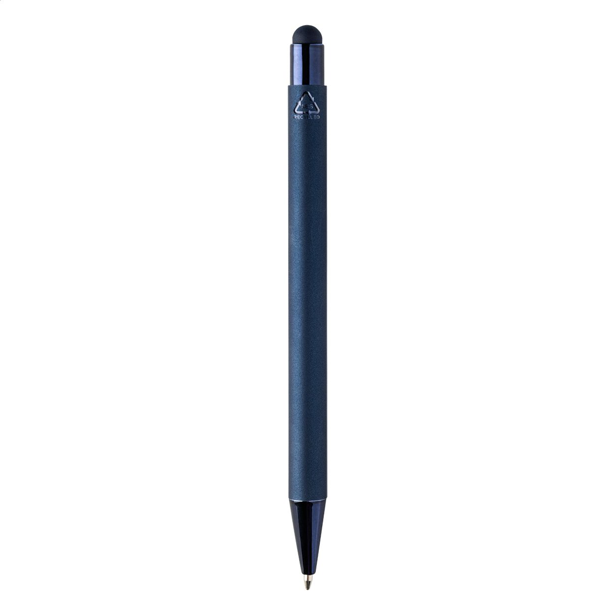 Penna a sfera capacitiva in alluminio riciclato con refill blu, fusto gommato e parti con finitura colorata metallizzata lucida. Lo speciale rivestimento permette l'incisione a specchio coordinata con le parti metalliche.