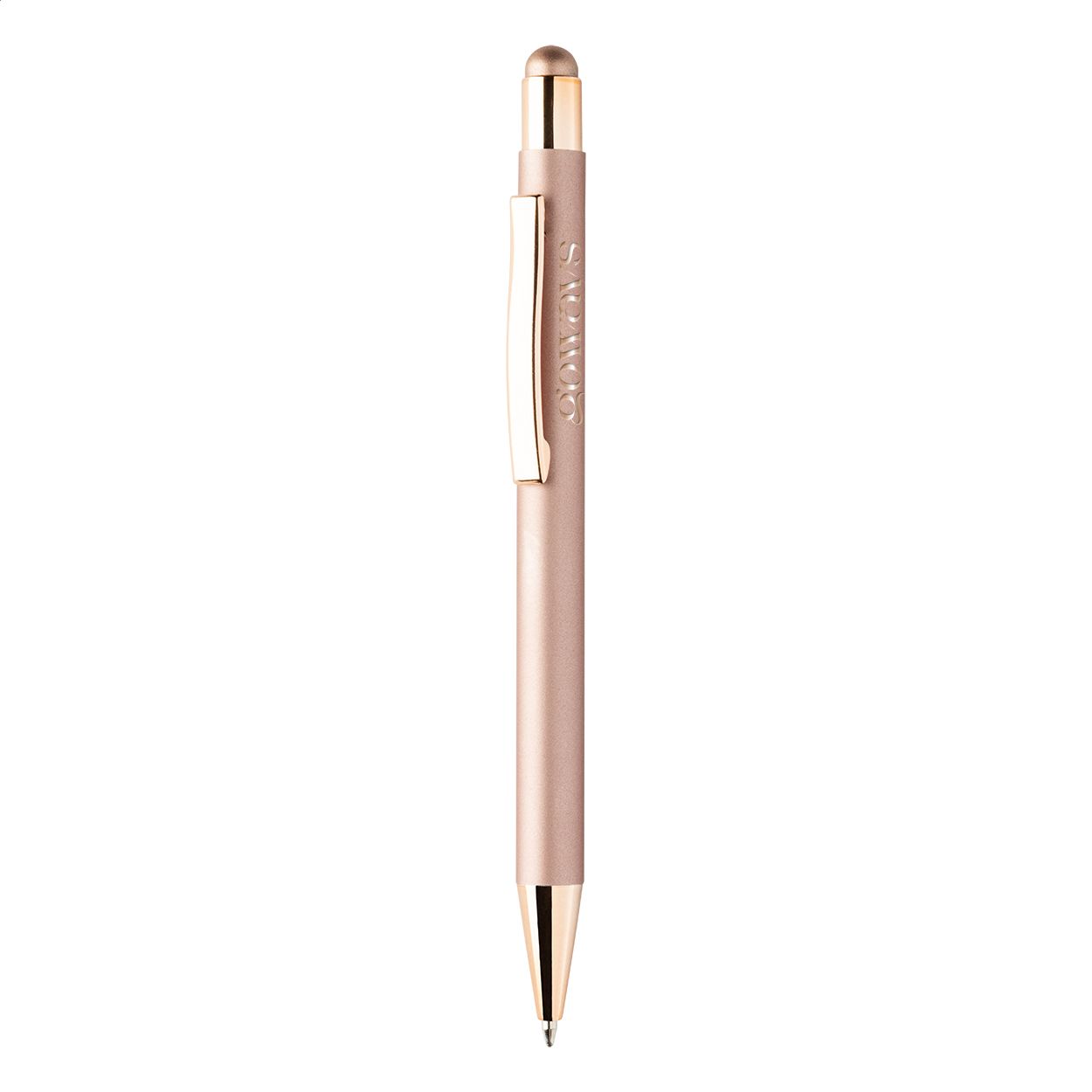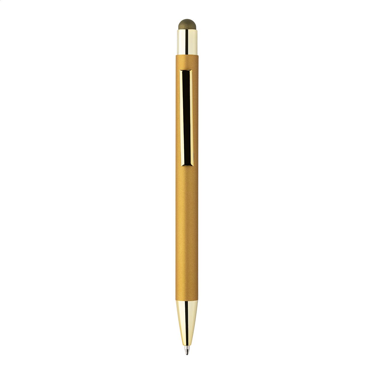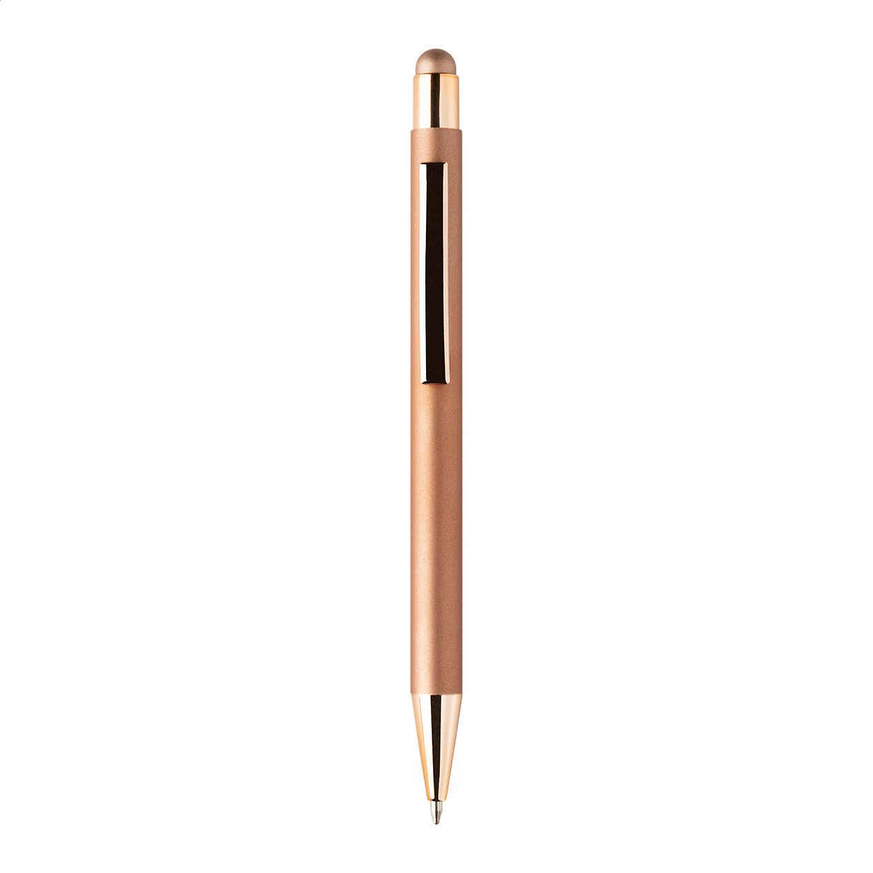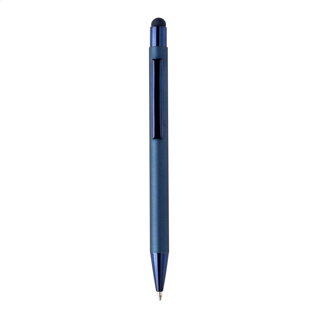 Penna a sfera capacitiva in alluminio riciclato con refill blu, fusto gommato e parti con finitura colorata metallizzata lucida. Lo speciale rivestimento permette l'incisione a specchio coordinata con le parti metalliche.