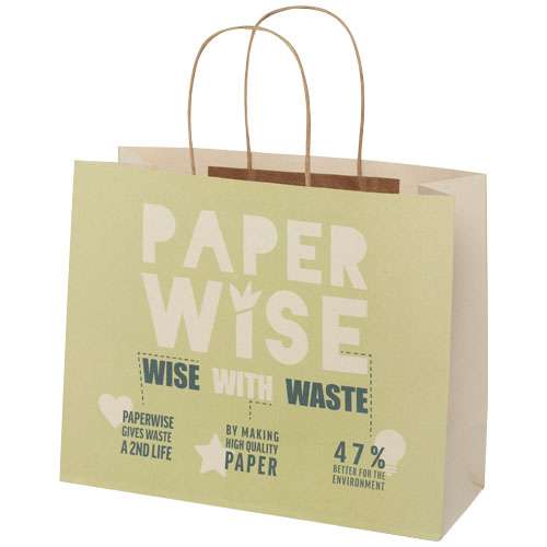 Shopper in carta grande da 150 g/m² (31 x 12 x 25 cm) realizzato con scarti agricoli e caratterizzato da manici di carta intrecciati. La parte anteriore e posteriore personalizzabili offrono un ampio spazio per stampare un logo o qualsiasi altro design, rendendolo un ottimo strumento di marketing aziendale. Realizzato in Europa e riciclabile al 100%, questo sacchetto è una scelta più sostenibile per aziende e persone attente all'ambiente in cerca di una soluzione per il confezionamento sostenibile.
