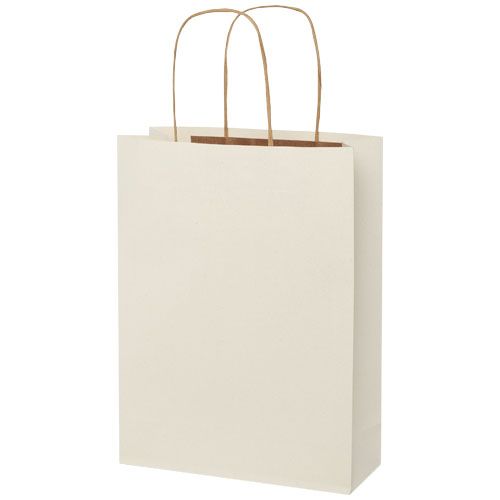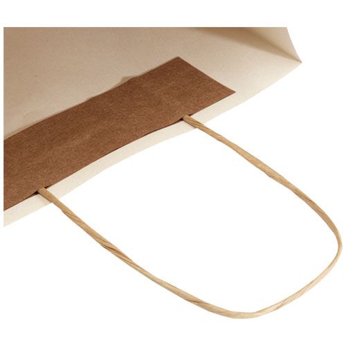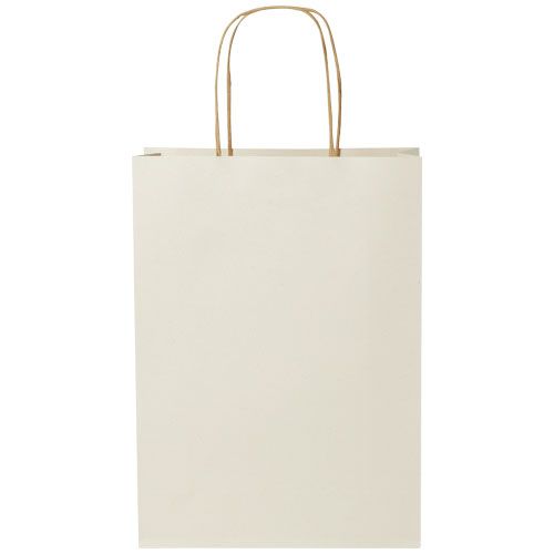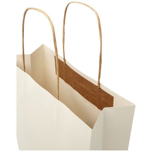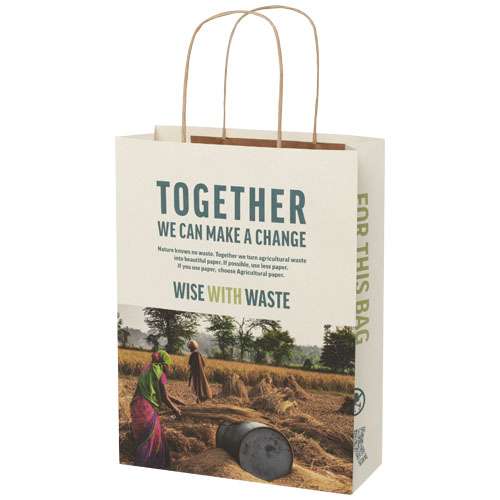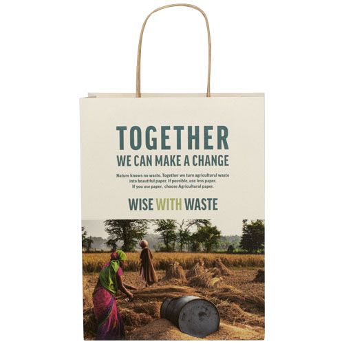 Shopper in carta medio da 150 g/m² (24 x 9 x 32 cm) realizzato con scarti agricoli e caratterizzato da manici di carta intrecciati. La parte anteriore e posteriore personalizzabili offrono un ampio spazio per stampare un logo o qualsiasi altro design, rendendolo un ottimo strumento di marketing aziendale. Realizzato in Europa e riciclabile al 100%, questo sacchetto è una scelta più sostenibile per aziende e persone attente all'ambiente in cerca di una soluzione per il confezionamento sostenibile.