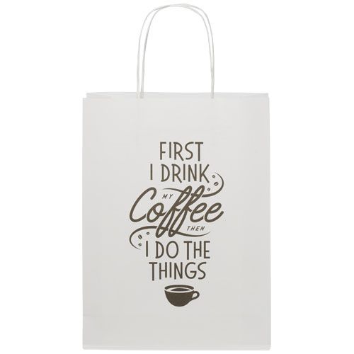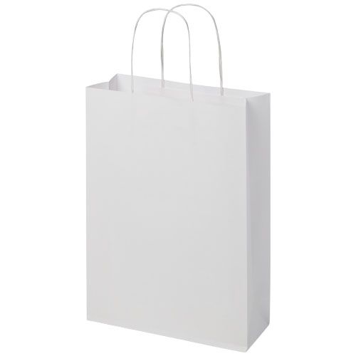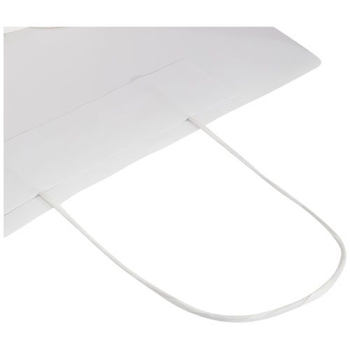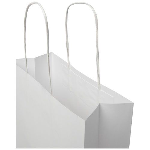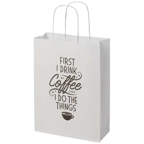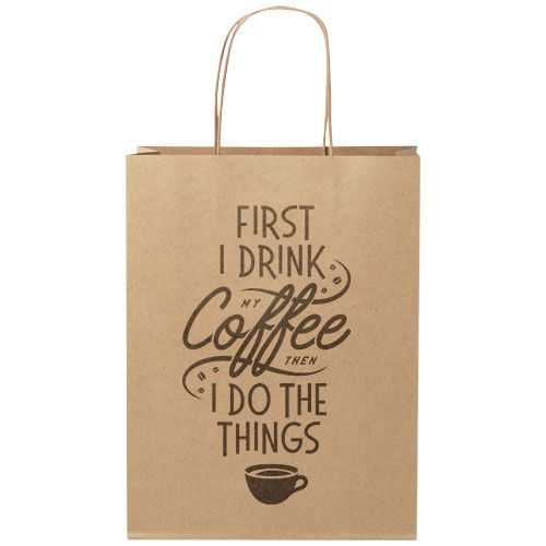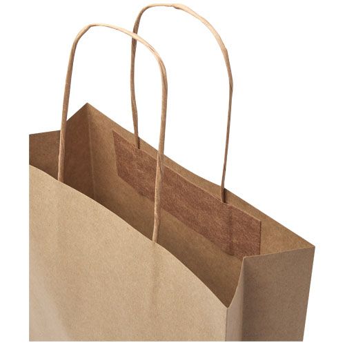 Shopper medio in carta kraft da 120 g/m² (24 x 9 x 32 cm) con manici di carta intrecciati. La parte anteriore e posteriore personalizzabili offrono un ampio spazio per stampare un logo o qualsiasi altro design, rendendolo un ottimo strumento di marketing aziendale. Realizzato in Europa e riciclabile al 100%, questo sacchetto è una scelta più sostenibile per aziende e persone attente all'ambiente in cerca di una soluzione per il confezionamento sostenibile.