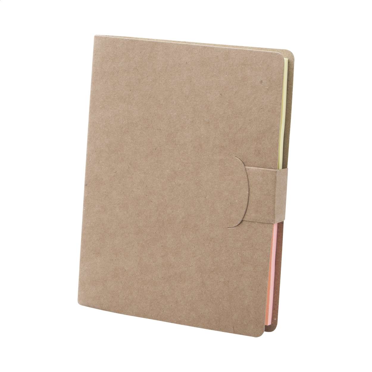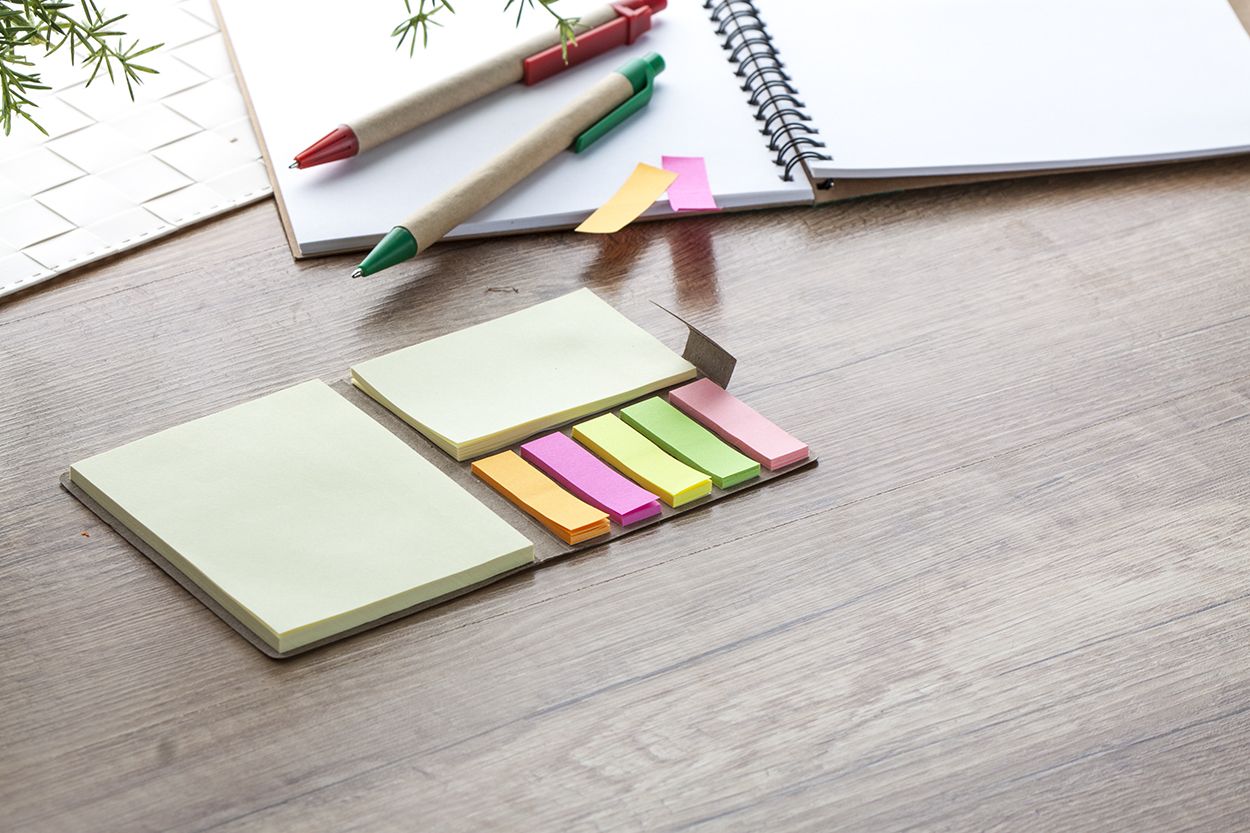 Blocco foglietti adesivi con 50 foglietti grandi, 25 medi, 125 segnapagina (in 5 colori diversi) e copertura in carta riciclata.
