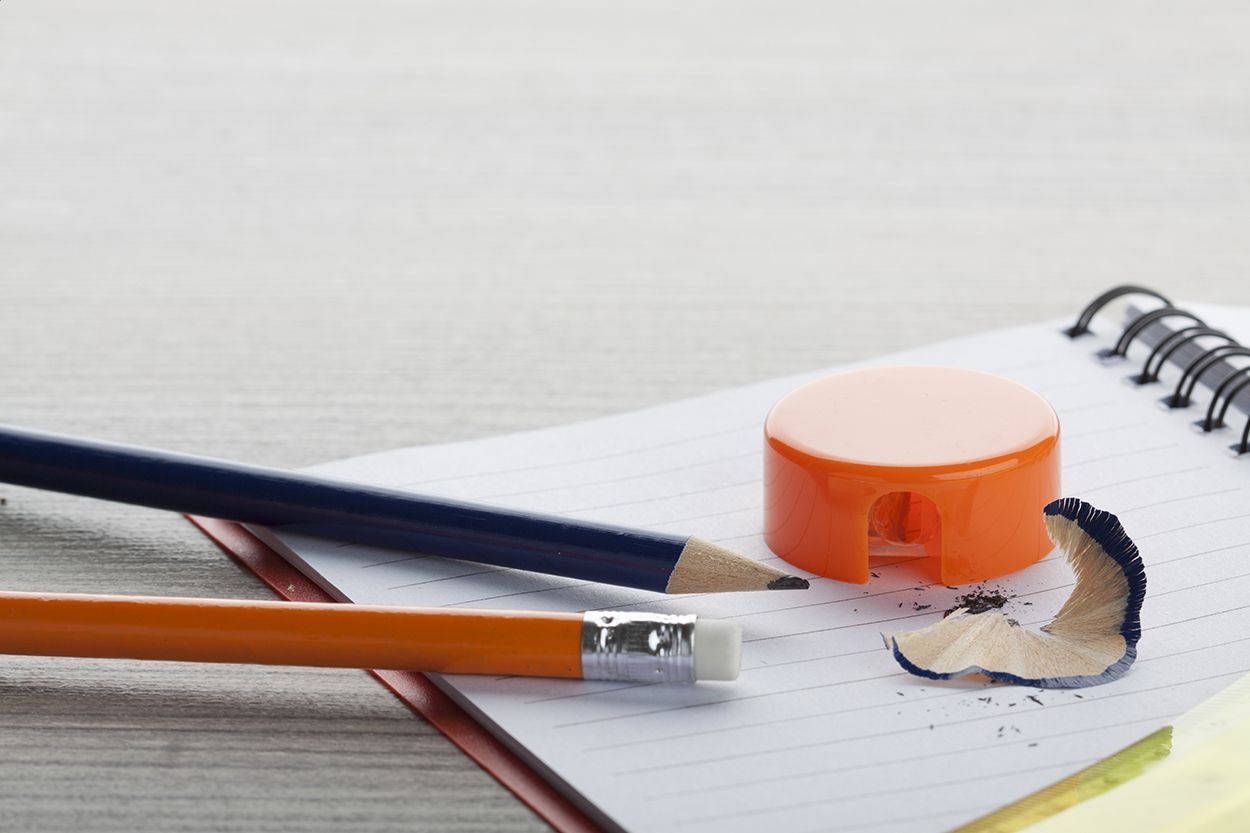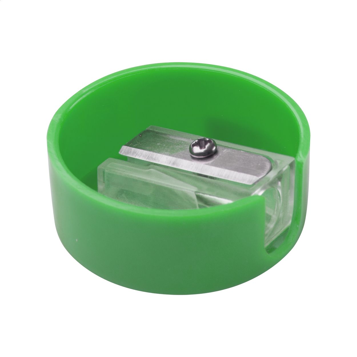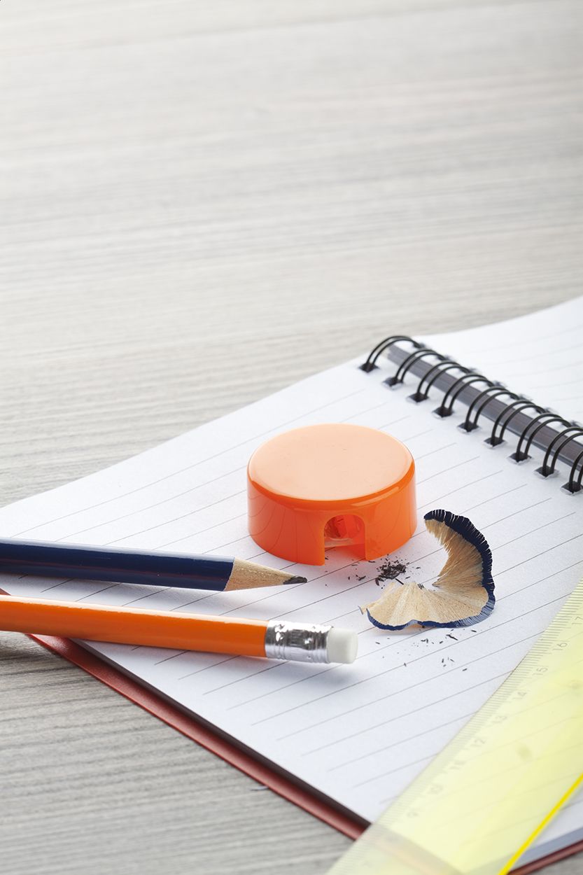 Temperamatite in plastica di forma rotonda.