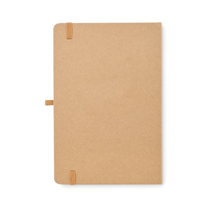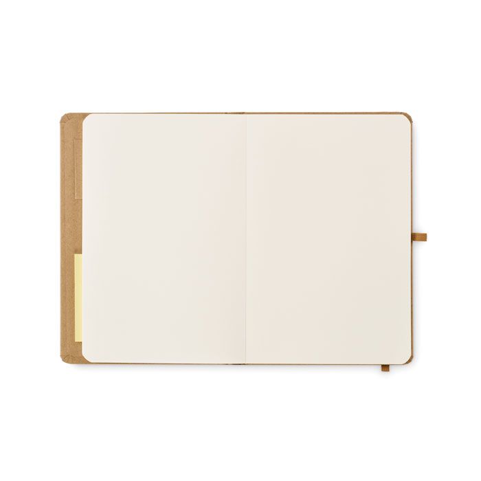 Notebook A5 con copertina in cartone con 80 fogli di carta riciclata (160 pagine) 25 fogli di note adesive e 25 memopad. Cinturino di chiusura elastico e portapenne.