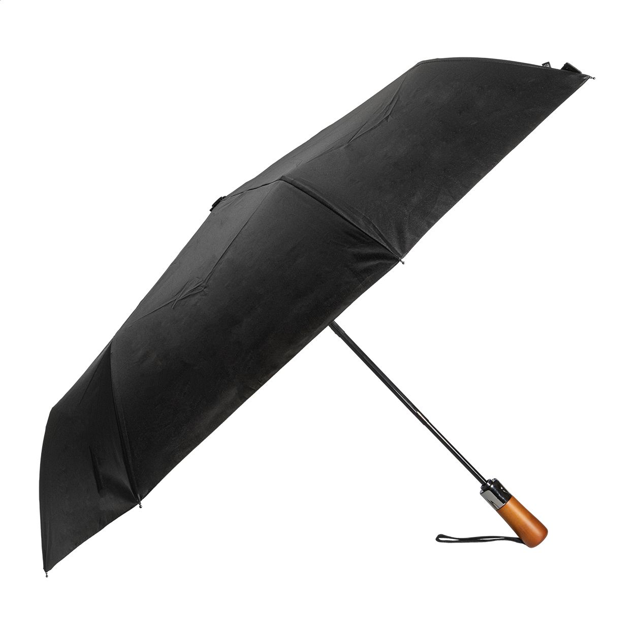Ombrello pieghevole antivento di grandi dimensioni, completamente automatico (apertura/chiusura), con 8 pannelli in pongee 190T RPET, telaio in metallo, stecche in fibra di vetro, elegante manico in legno con cinturino ed etichetta RPET.