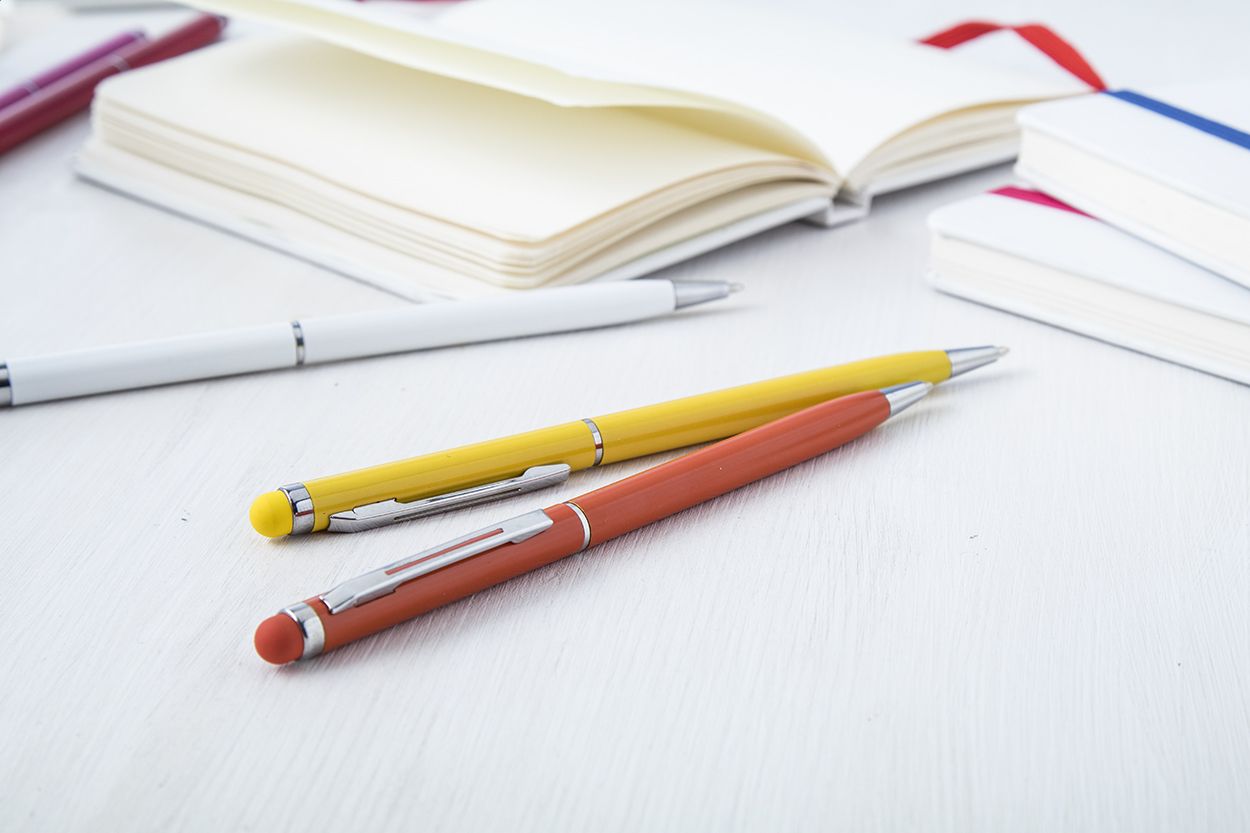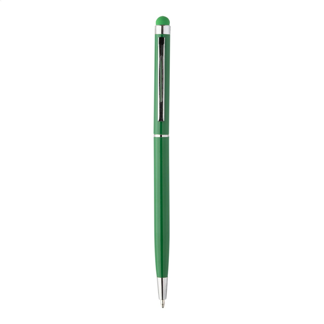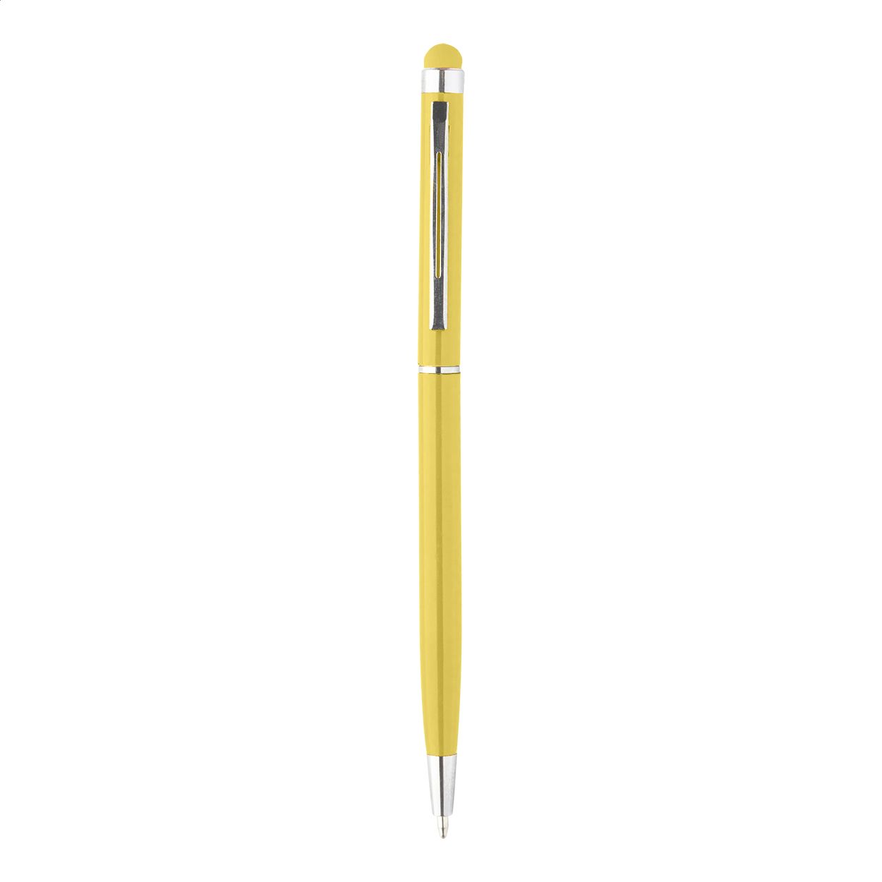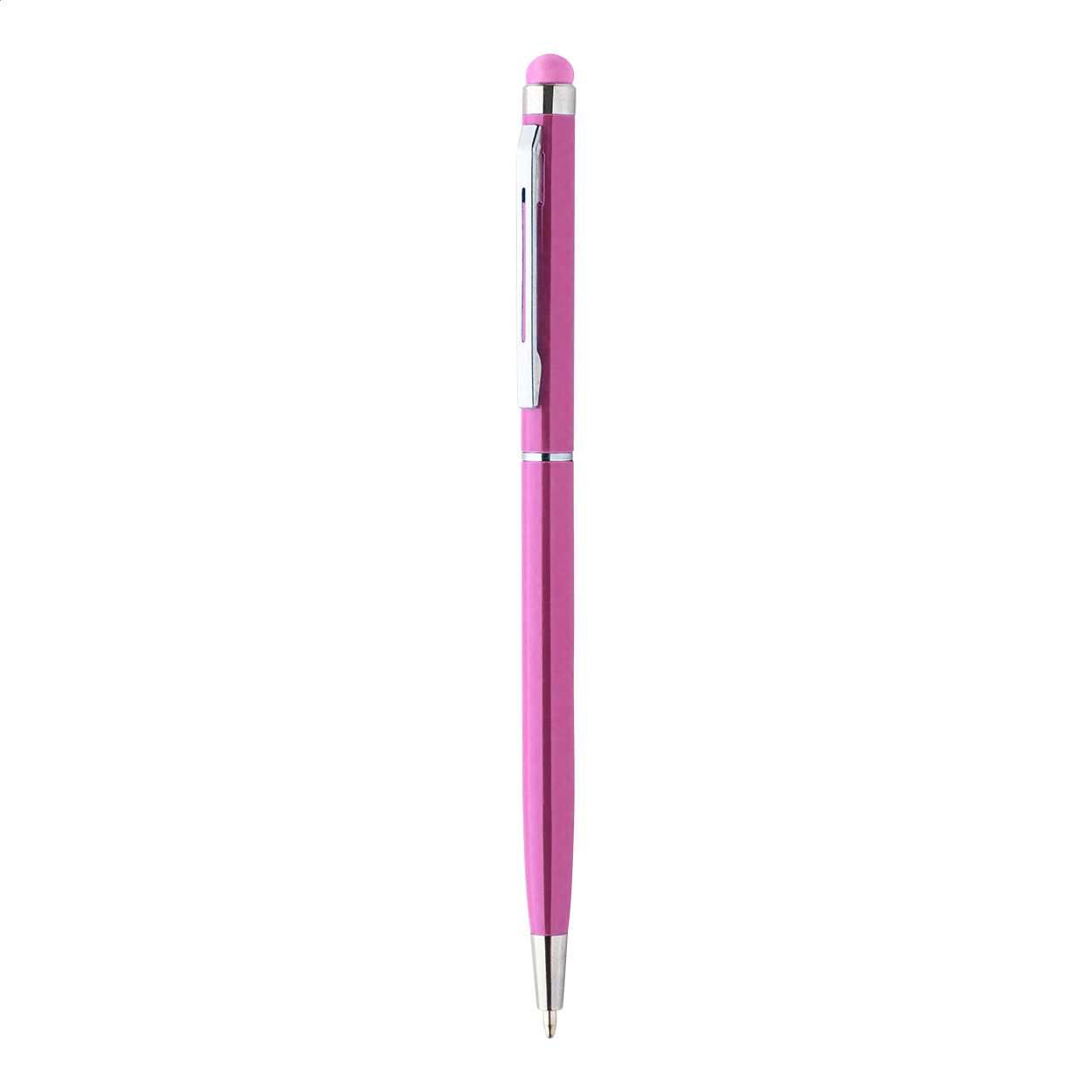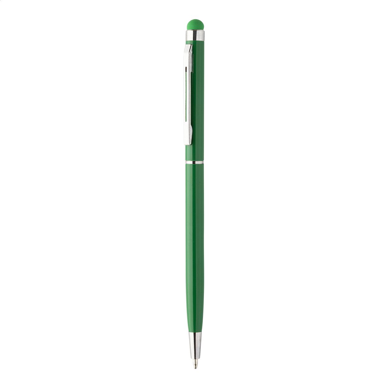 Penna a sfera in alluminio colorato con gommino capacitivo in colore coordinato e refill blu.