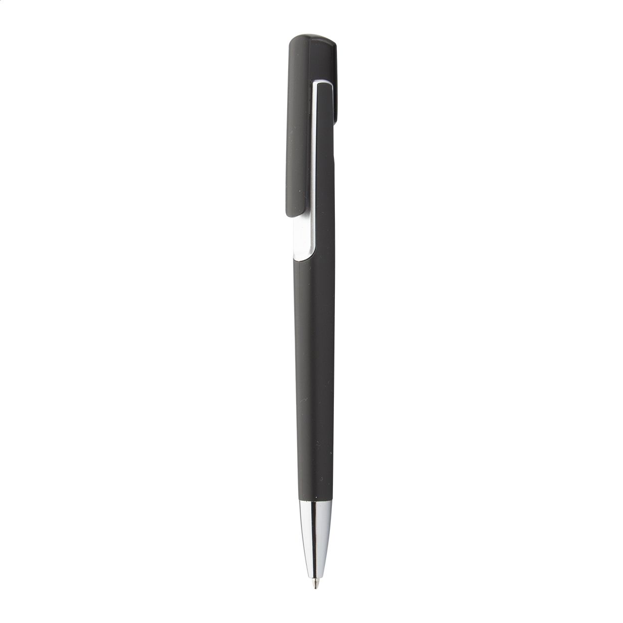 Penna a sfera in plastica nera con particolari colorati e puntale in cromato. Fornita con refill blu.