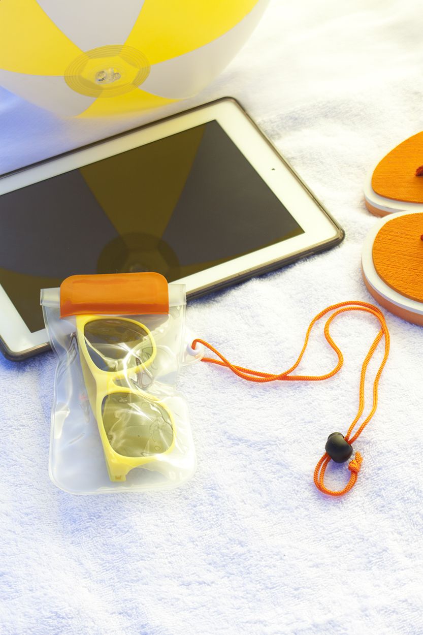 Custodia cellulare impermeabile in plastica con laccino da collo.