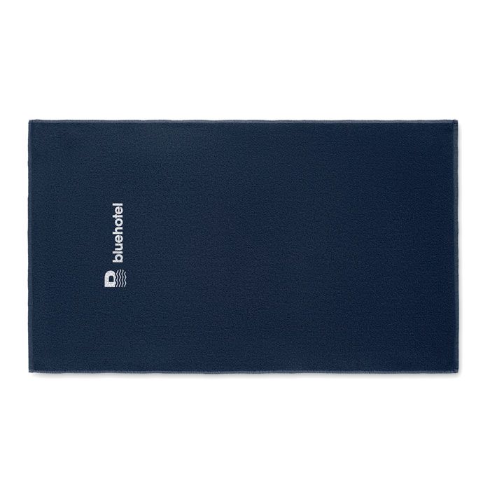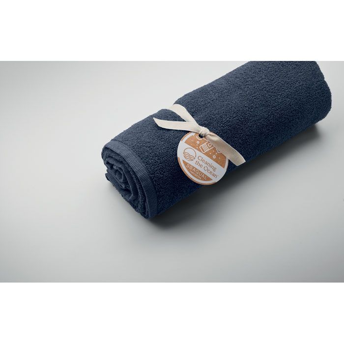 Telo da bagno o da spiaggia in tessuto riciclato eco jacquard. 70% cotone riciclato e 30% poliestere riciclato SEAQUAL® YARN. 500 gr/m². 100x170 cm. SEAQUAL INITIATIVE collabora con i centri di pulizia degli oceani di tutto il mondo per dare valore ai rifiuti che ai rifiuti che recuperano. Prodotto in UE.