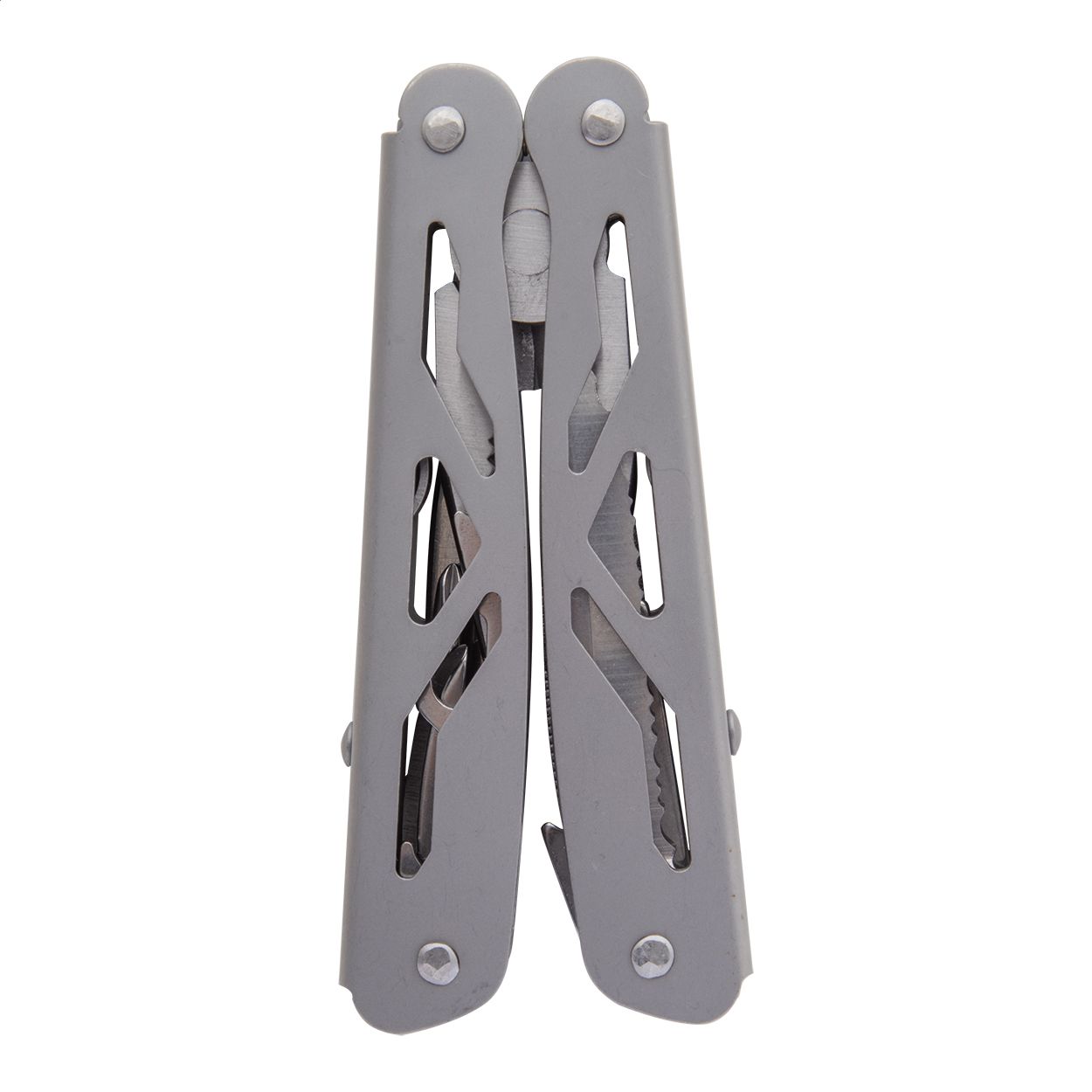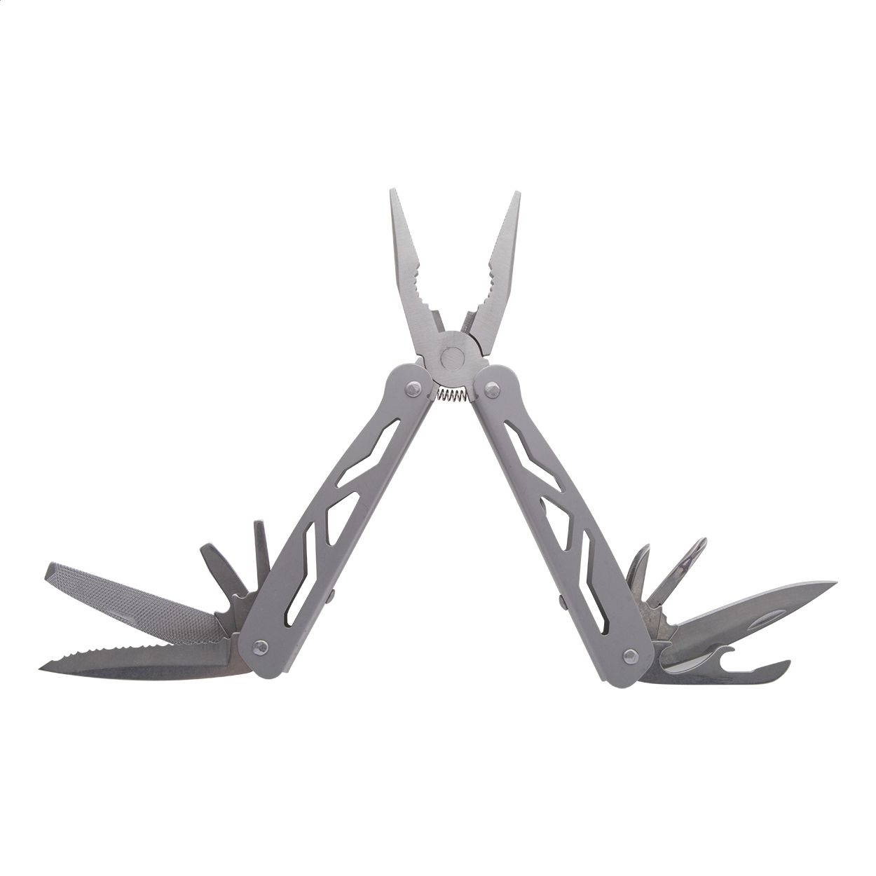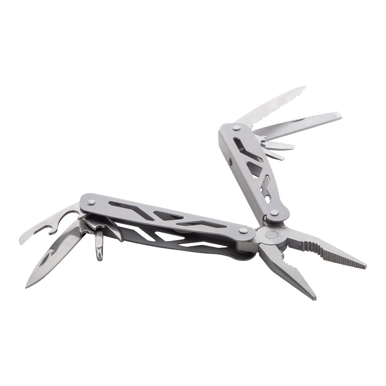 Multi utensile in acciaio inox con 9 funzioni ed astuccio di poliestere.
