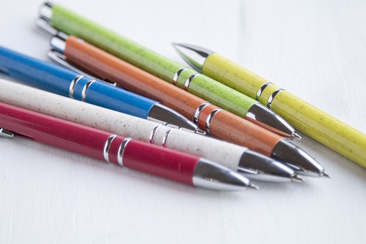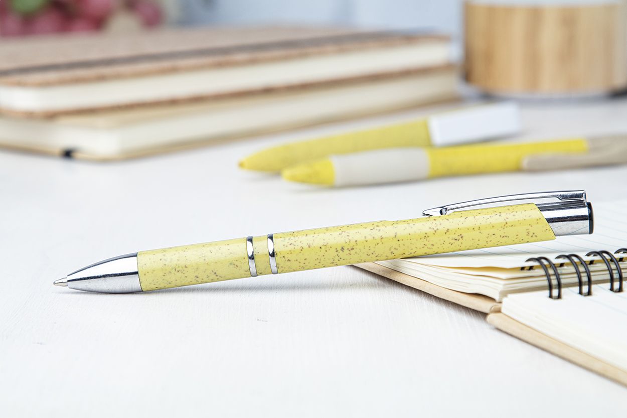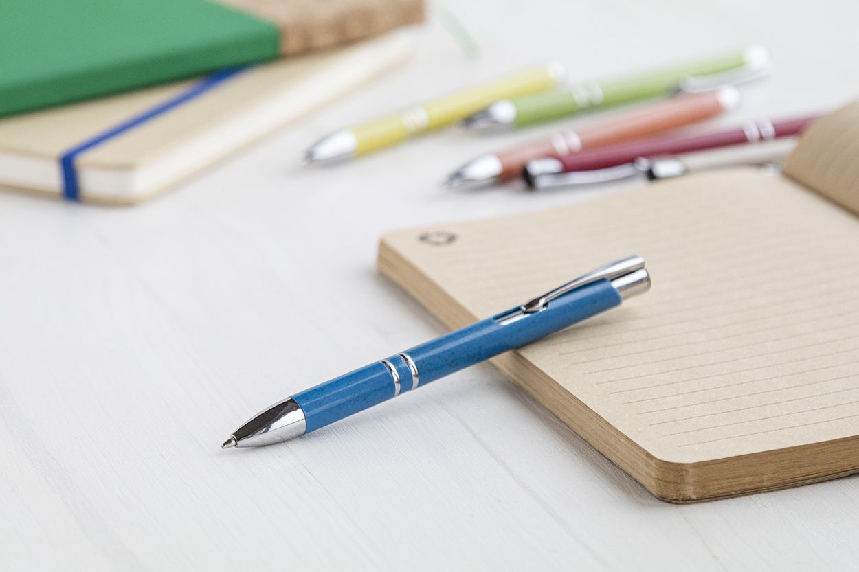 Penna a sfera in plastica ecologica con parti metalliche. Con refill blu.