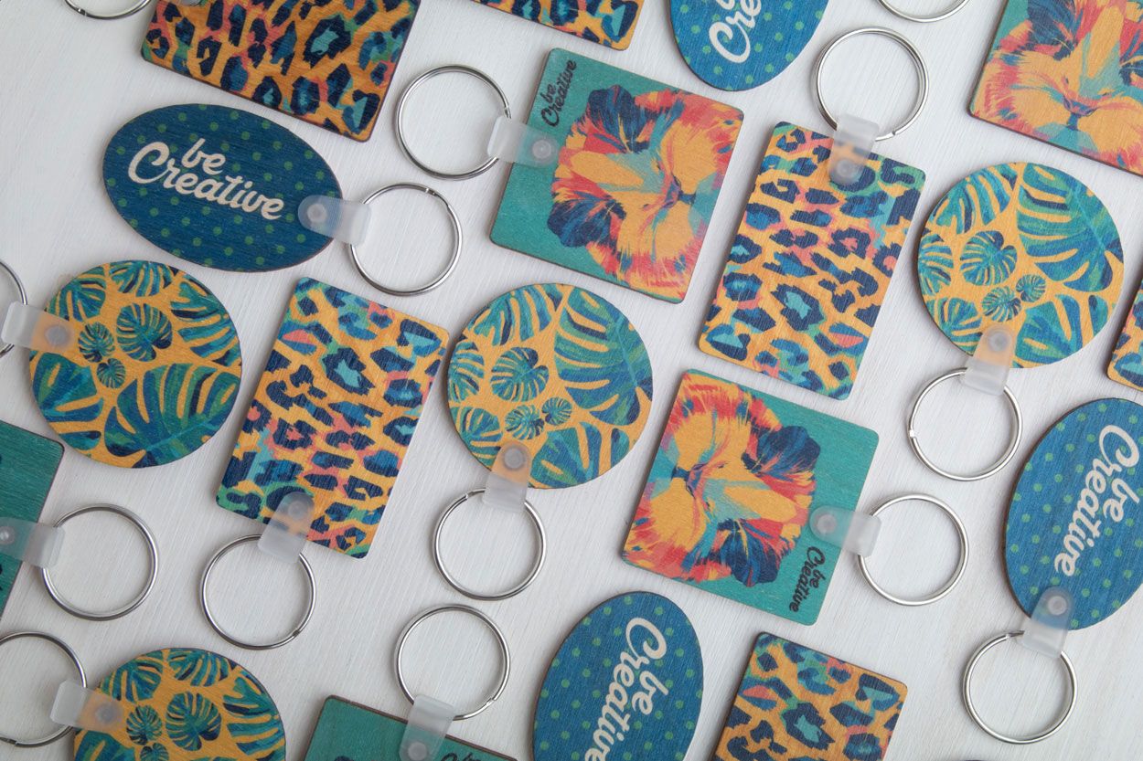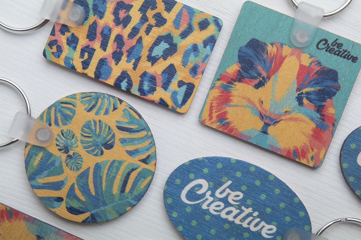 Portachiavi in legno di betulla laminato di forma ovale con stampa a colori. Il prezzo include la stampa UV LED su un solo lato. Quantità minima: 200 pezzi.