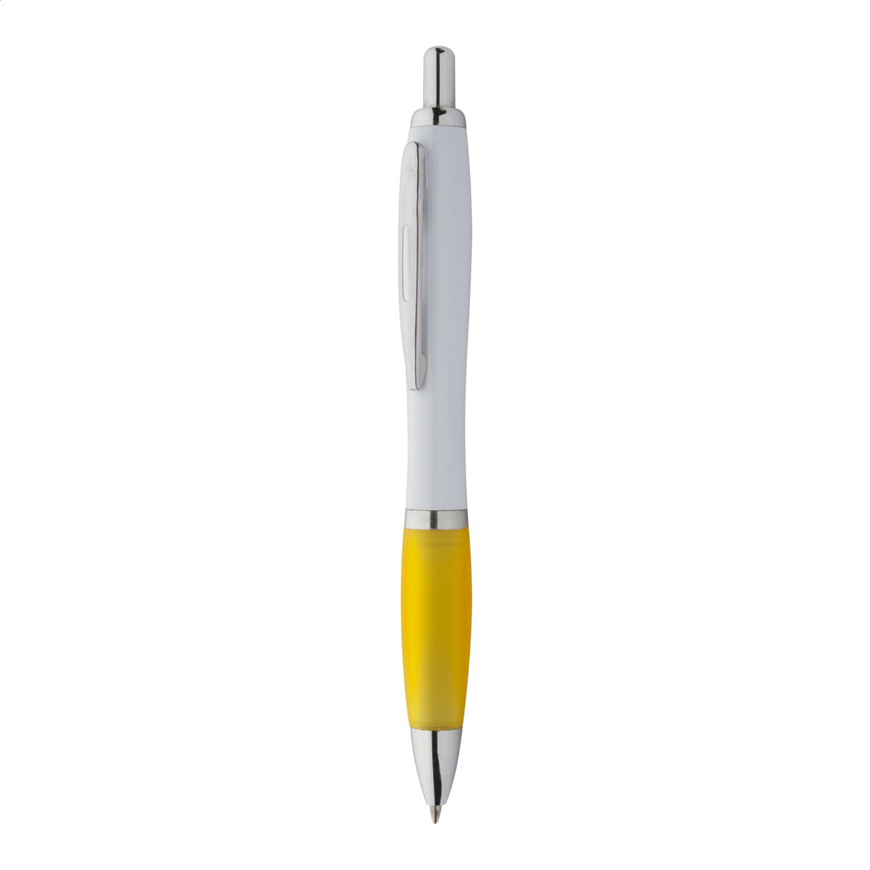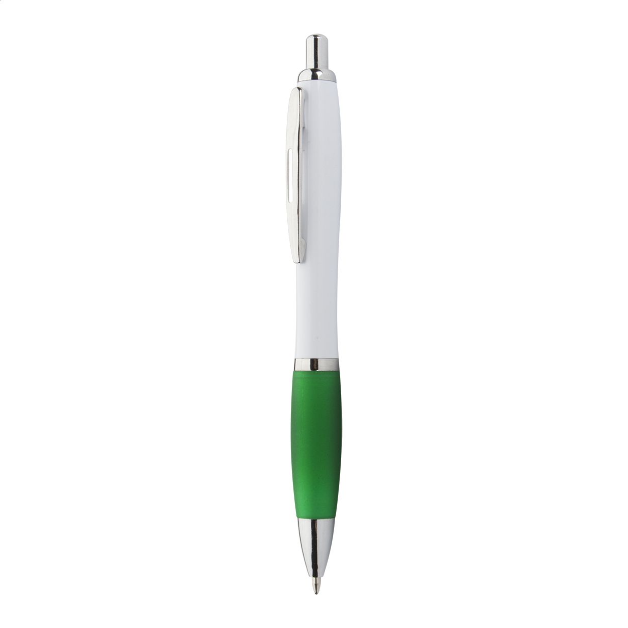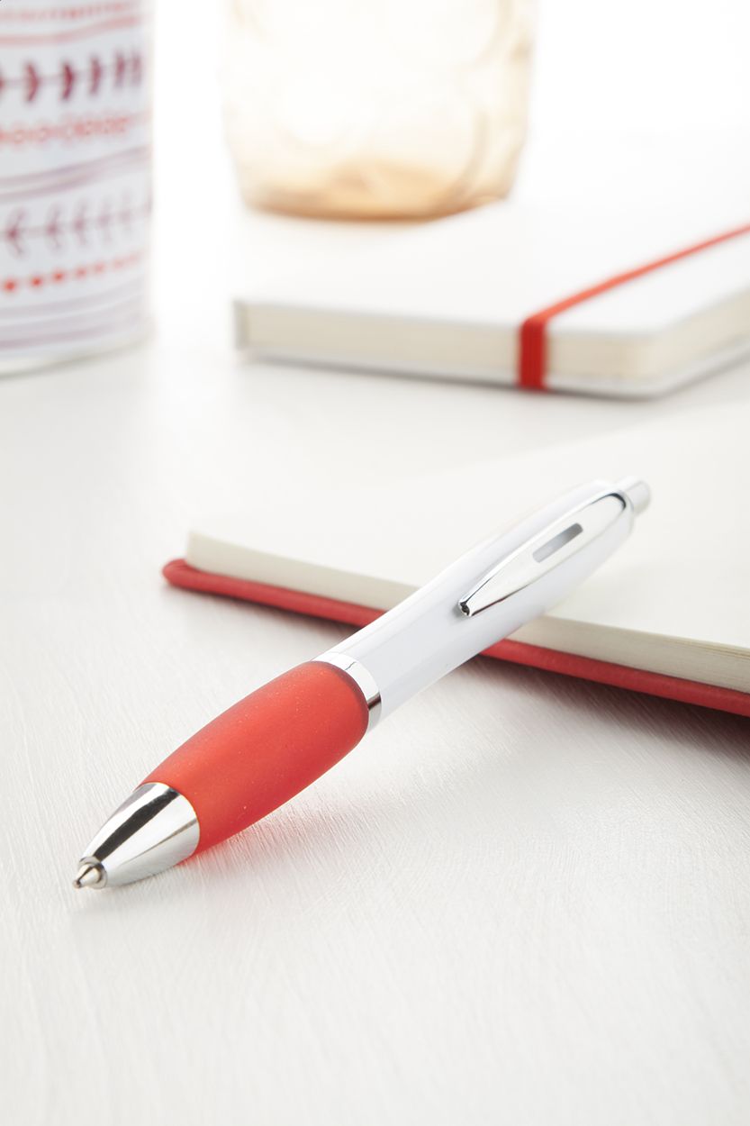 Penna a sfera in plastica con corpo bianco, impugnatura in colorata e parti cromate lucide. Fornita con refill blu.
