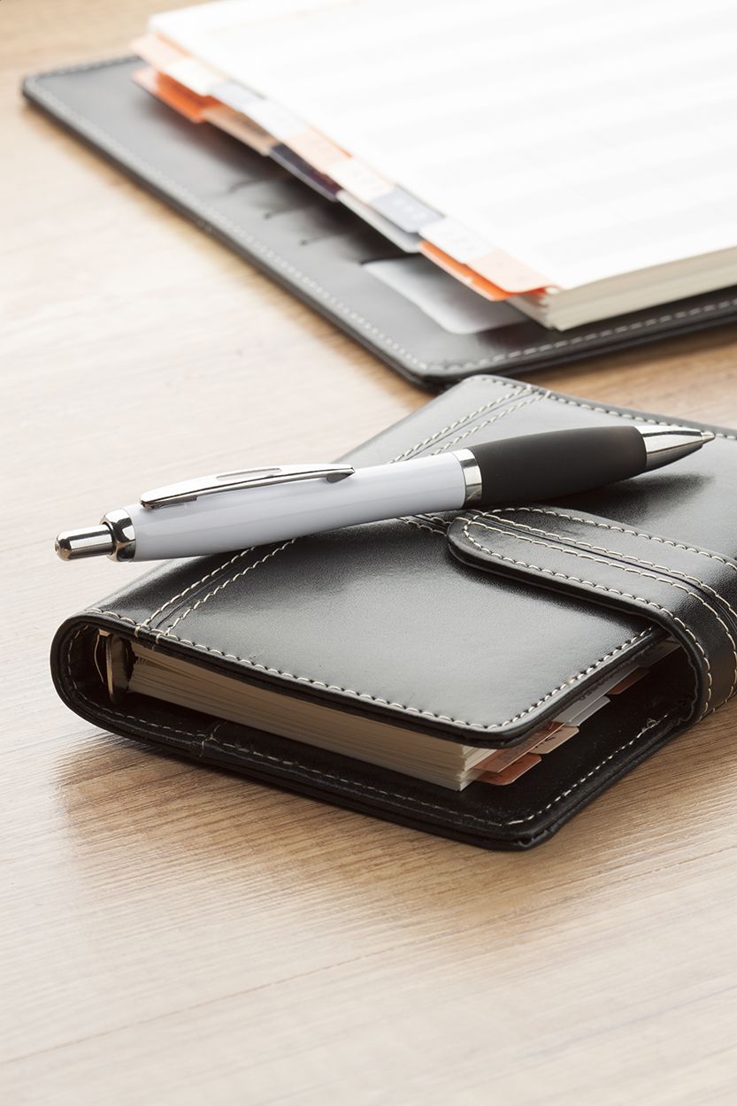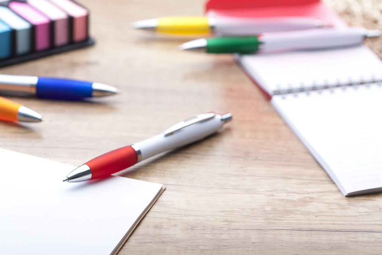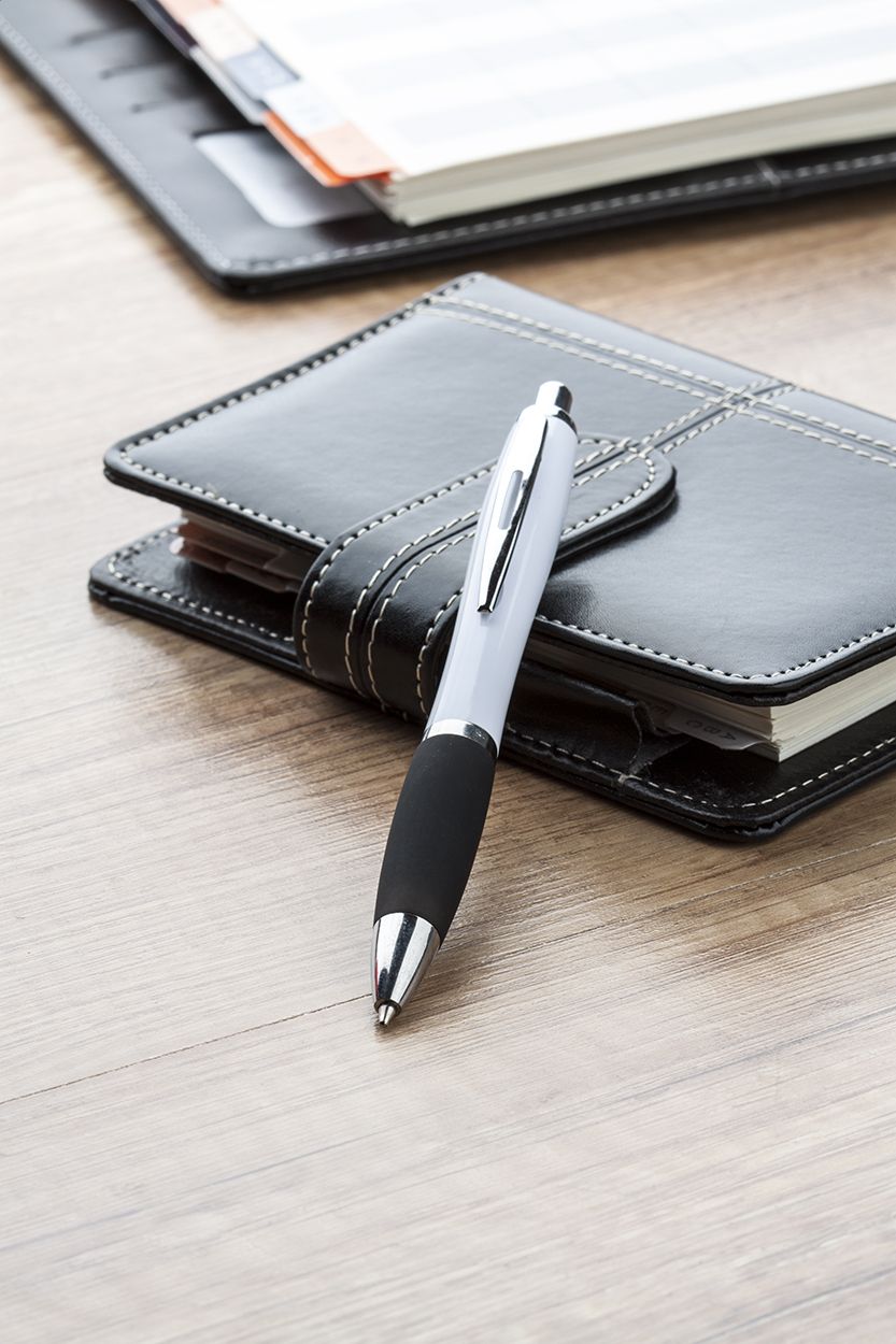 Penna a sfera in plastica con corpo bianco, impugnatura in colorata e parti cromate lucide. Fornita con refill blu.