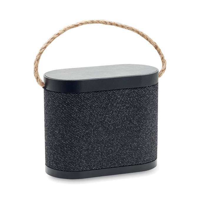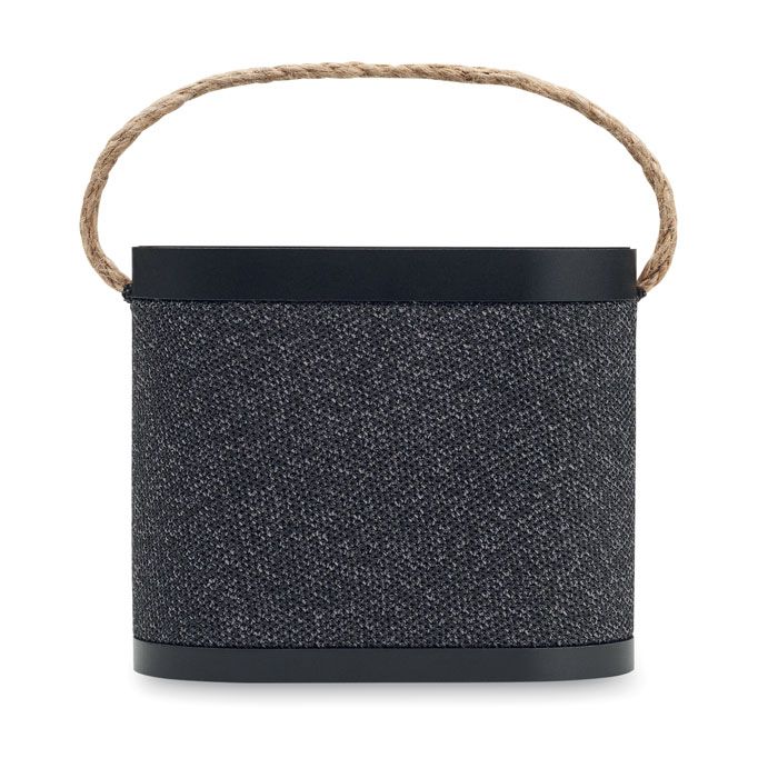 5.3 speaker wireless in ABS con finitura in tessuto poliestere RPET e caricatore wireless da 15W in bamboo, con maniglia in iuta. 1 batteria ricaricabile agli ioni di litio da 1200 mAh. Dati di uscita: 5W, 4 Ohm e 5V. Tempo di riproduzione di circa 4 ore.