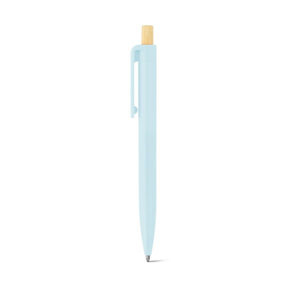 Penna a sfera in ABS riciclato (100% rABS) con pulsante in bambù. Inchiostro blu. Poiché il prodotto è realizzato con materiali naturali, il colore del prodotto e il risultato della stampa possono variare da un prodotto all'altro. ø11 x 134 mm