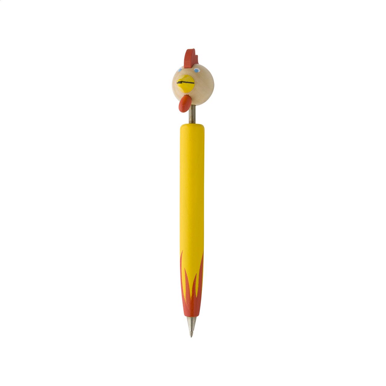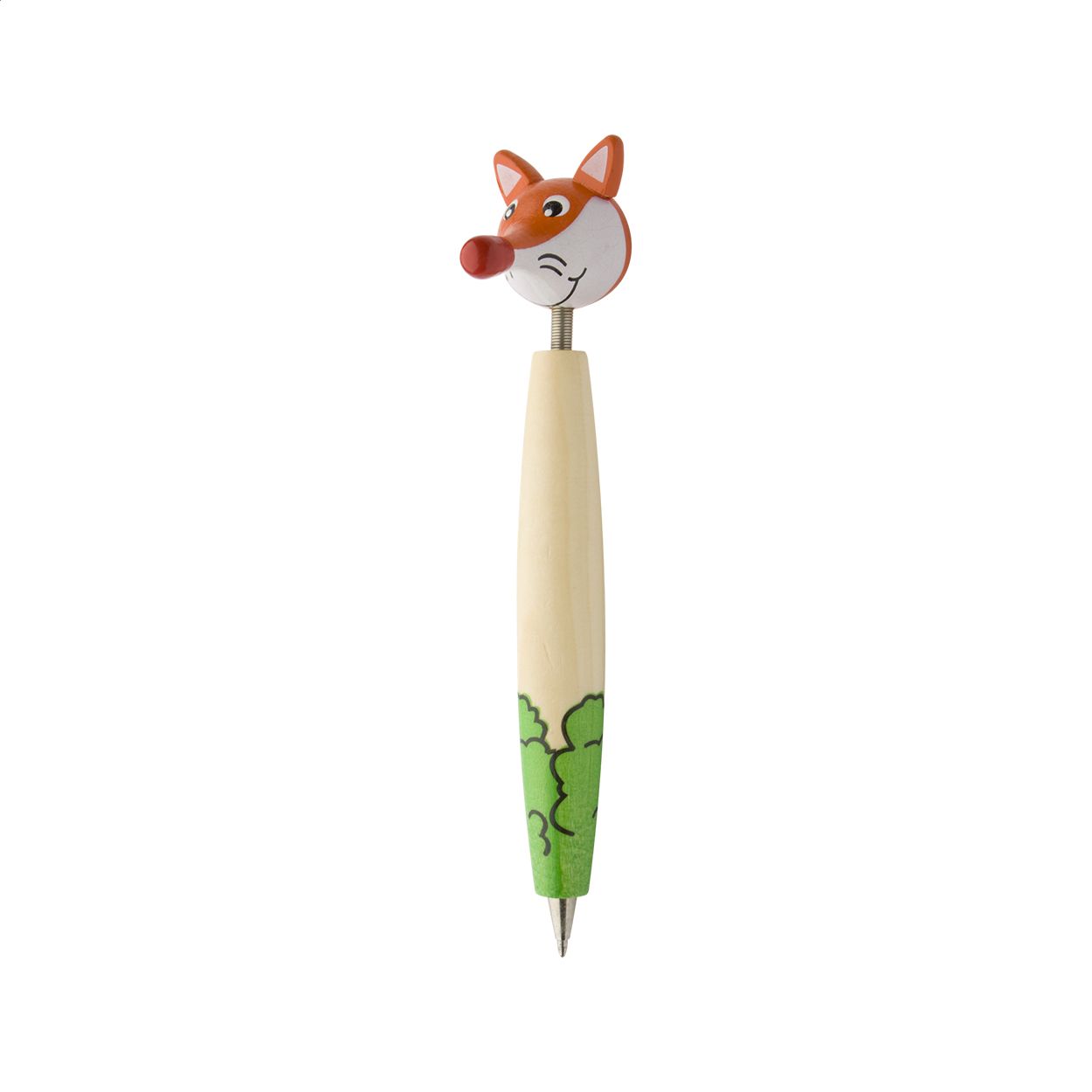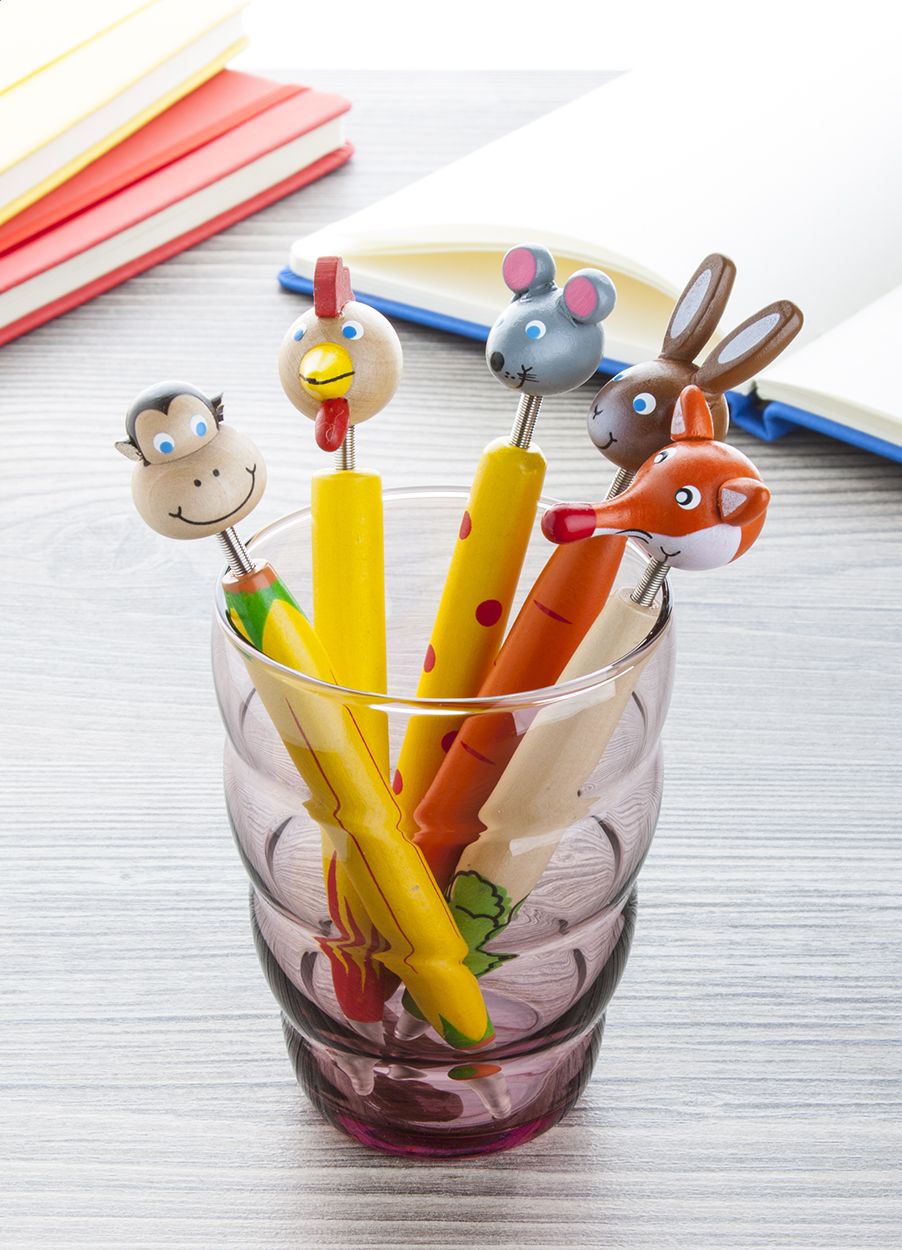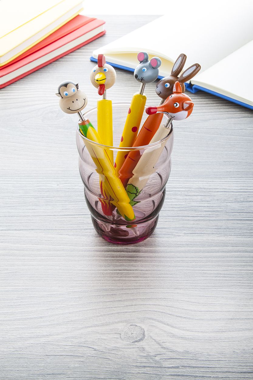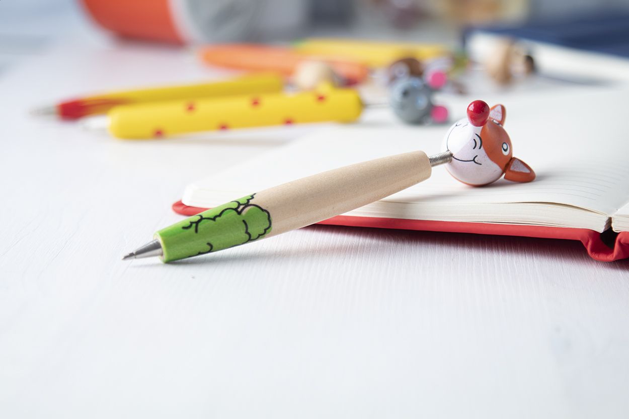 Penna a sfera in legno colorata con figura animale e refill blu.